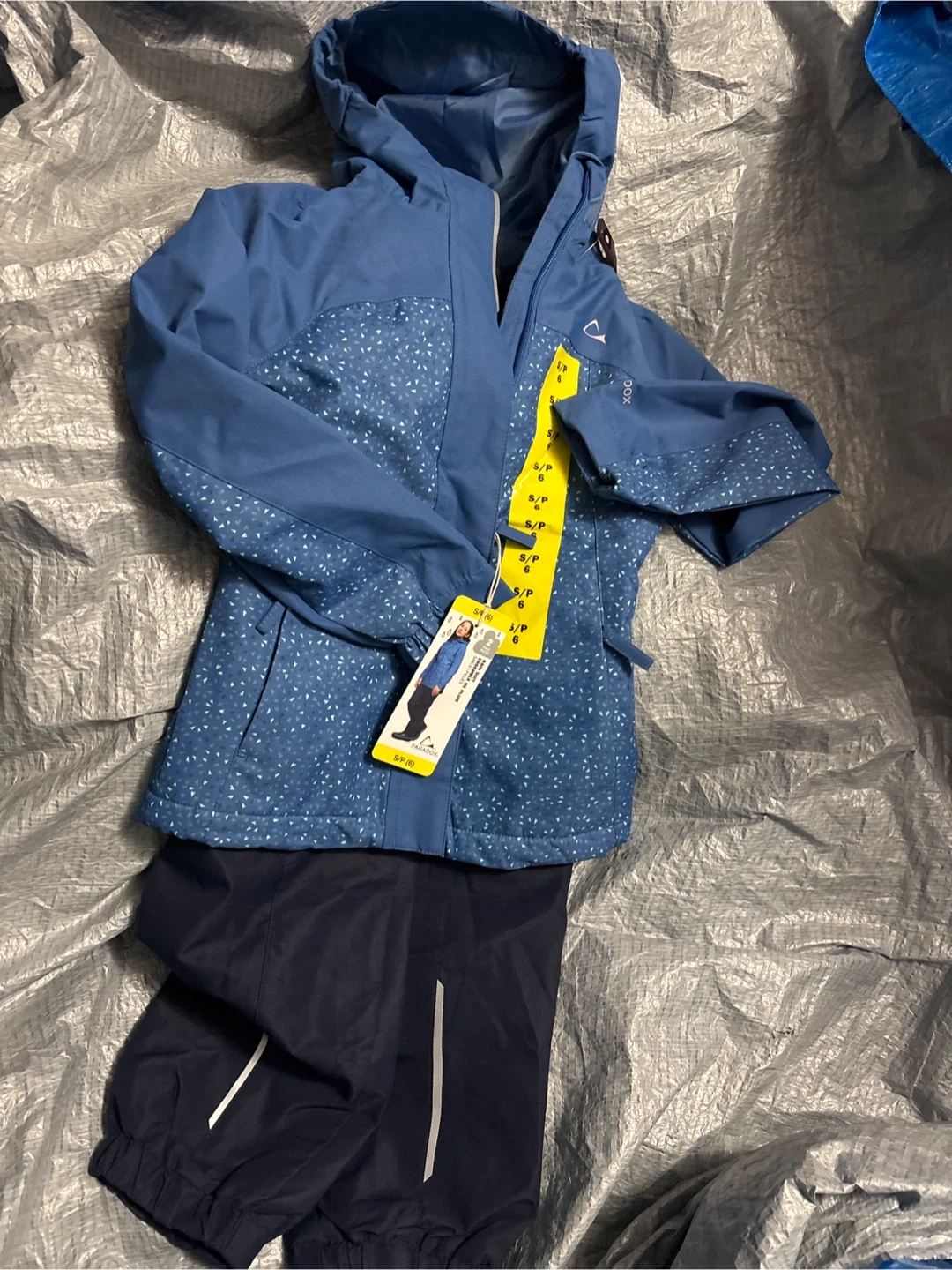 This is a brand new Paradox rain suit for girls! It's a size 6 and includes both the jacket and pants. It's water resistant and has a fleece lining to keep your little one dry and cozy on rainy days