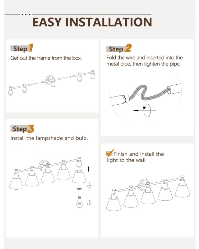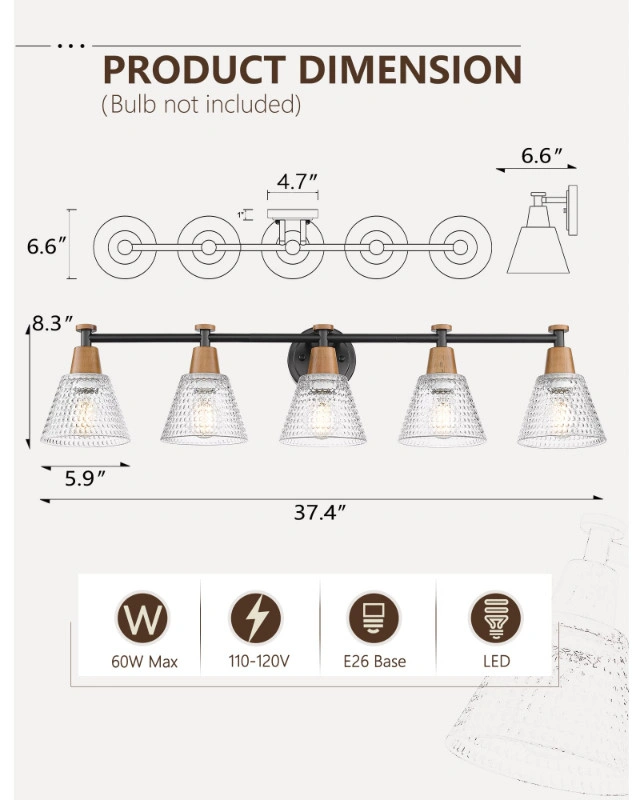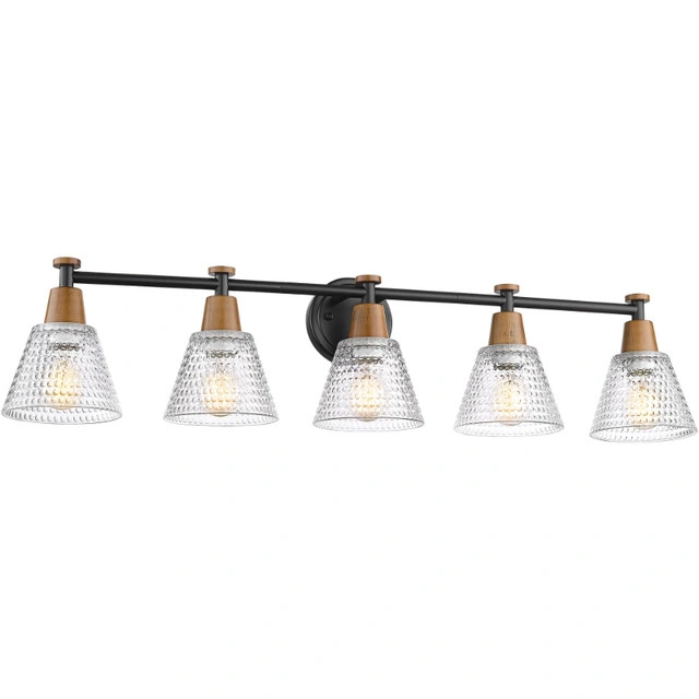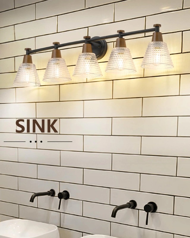 FEMILA Vanity Lighting Fixtures, Black Bathroom Light Fixtures, Farmhouse Bathroom Vanity Light, 5-Light Vanity Light with Hammered Metal Shade, 4FG75BG2-5W BK Top highlights: Brand: FEMILA Color: Black & Wood Material: Glass, Metal Style: Modern Light fixture form: Vanity Room Type: Bathroom 【Farmhouse & Unique Design】Our bathroom lights over mirror a black sturdy metal lamp body with a wood grain paint finish, complemented by a hammered glass shade reflects a beautiful light and shadow on the wall, adding a unique and stylish touch to your bathroom decor. 【Wide Application】This black bathroom light fixtures is perfect for various spaces, including bathrooms, bedrooms, powder rooms, porches, and kitchens. It can be installed over mirrors or sinks, offering versatile lighting options throughout your home. 【Easy Installation & Perfect Dimension】With dimensions of 37.4" x 6.6" x 8.3" (LxWxH), our bathroom light fixtures wall mount are designed for easy installation. All necessary hardware and installation instructions are included in the package, making it a hassle-free addition to your space. 【Bulb Requirements】Our 5 light bathroom vanity light supports any E26 base bulbs with a maximum wattage of 60W each (bulbs not included). It is also dimmable when used with a dimmable bulb and compatible dimmer switch, allowing you to create the perfect ambiance for any occasion.