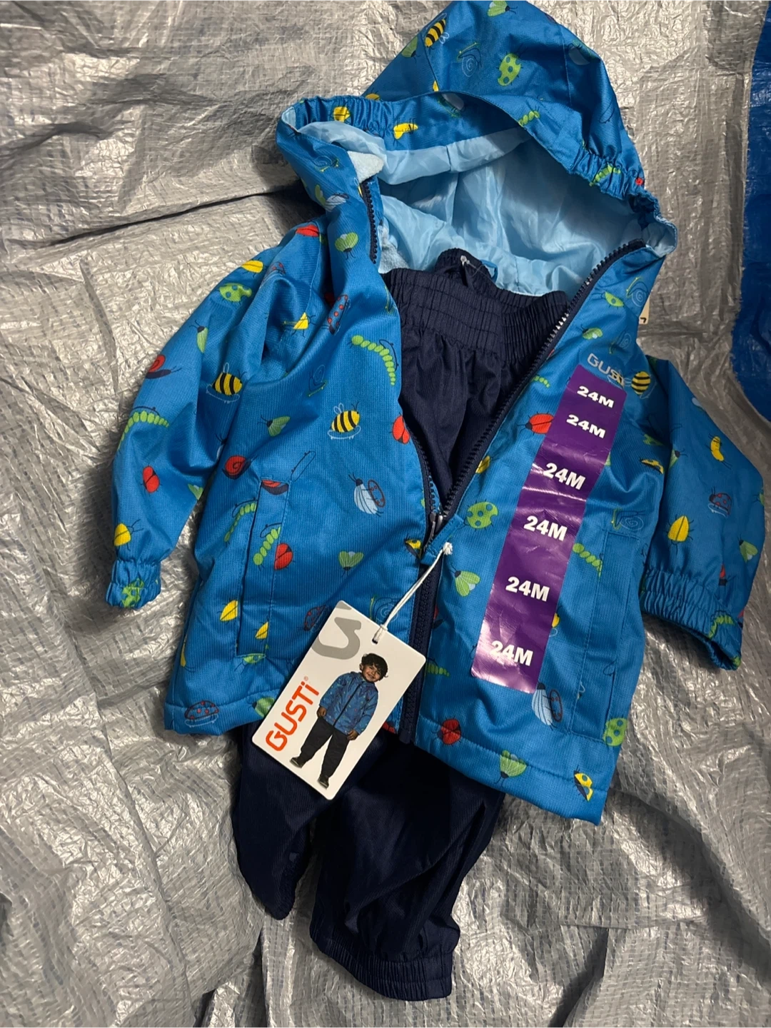New Gusti rain jacket and pants set for a little one! The set is size 24M and features a cute blue design with colourful insects. Elastic at cuffs and sides of hood and elastic waist for comfort