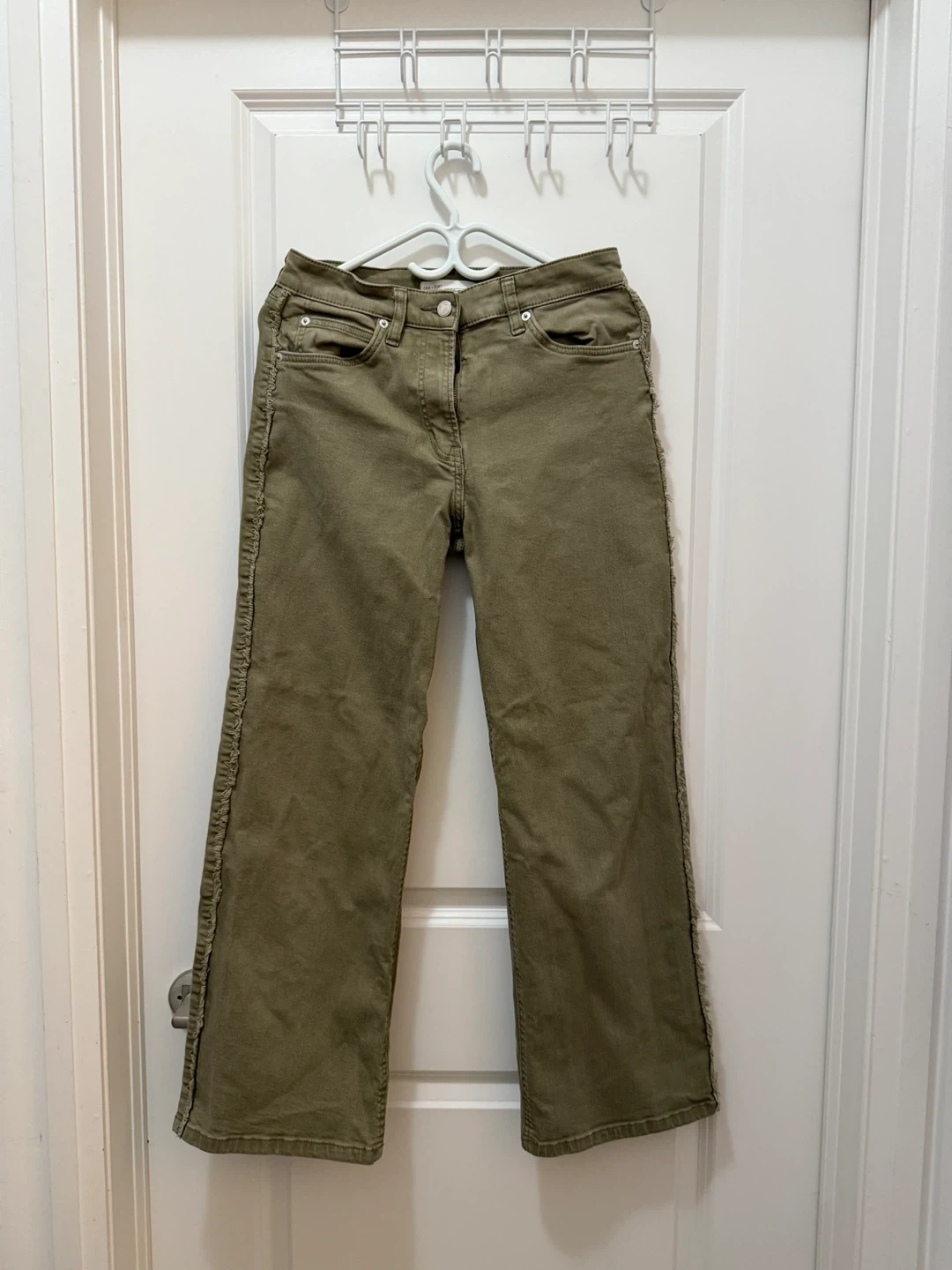 Oak + Fort wide leg jeans in a unique olive green colour! They're in great condition and would be a lovely addition to your wardrobe. The material feels durable and comfortable, perfect for everyday wear.