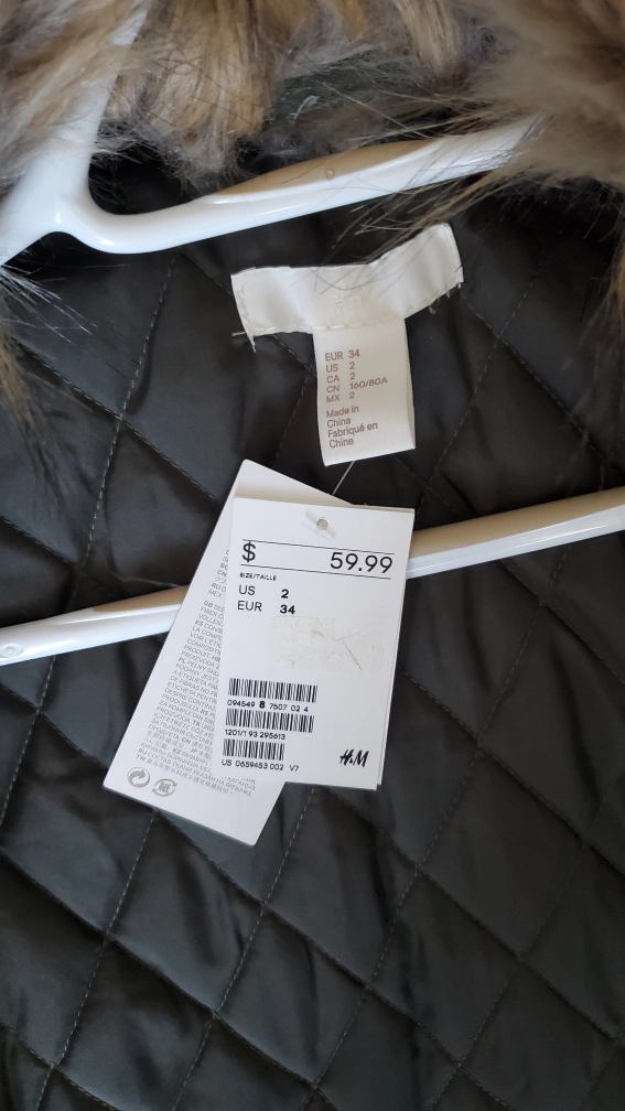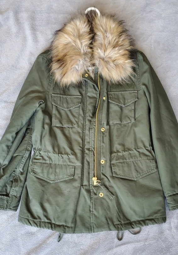 This H&M parka is ready for a new home! It's a stylish green colour and features a cozy faux fur trim around the hood. The size is US 2 / EUR 34. Originally bought for $59.99.
