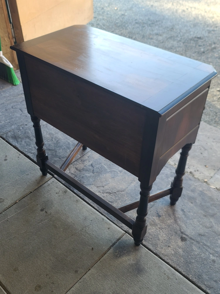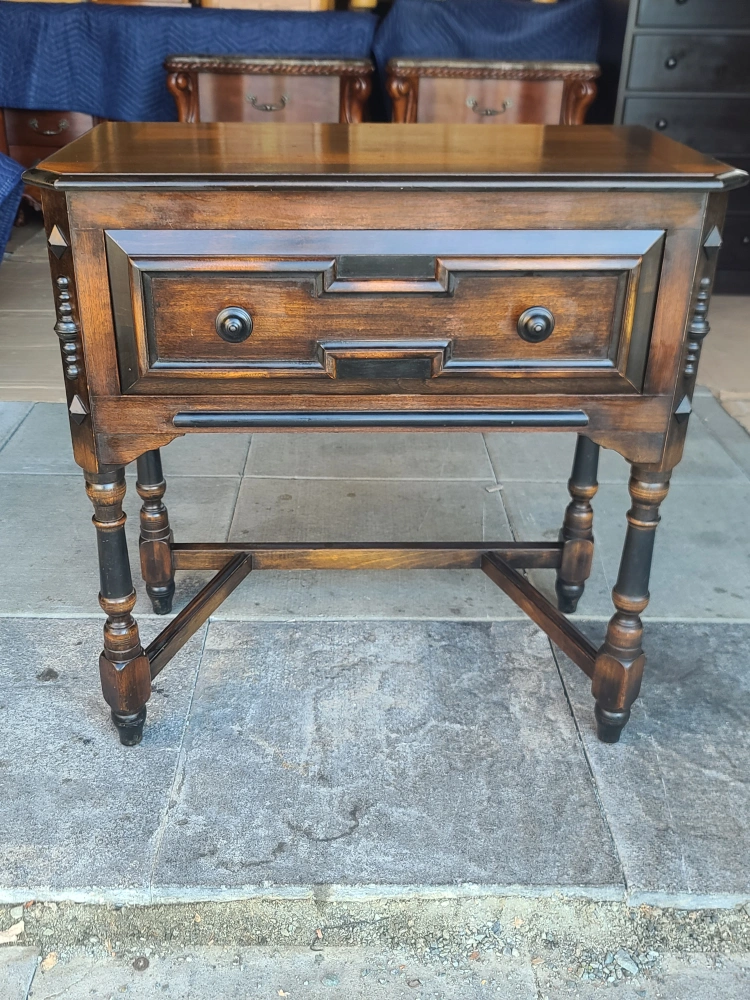 A very beautiful antique side table made of solid wood. It features a handy drawer for storage. The table has a lovely dark wood finish and a unique design. It would look great in any room! Measurements to follow. Delivery can be arranged. Viewing and pickup by appointment.