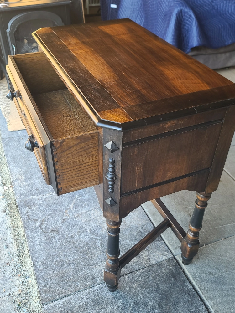 A very beautiful antique side table made of solid wood. It features a handy drawer for storage. The table has a lovely dark wood finish and a unique design. It would look great in any room! Measurements to follow. Delivery can be arranged. Viewing and pickup by appointment.