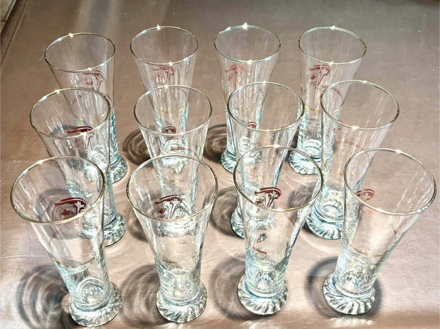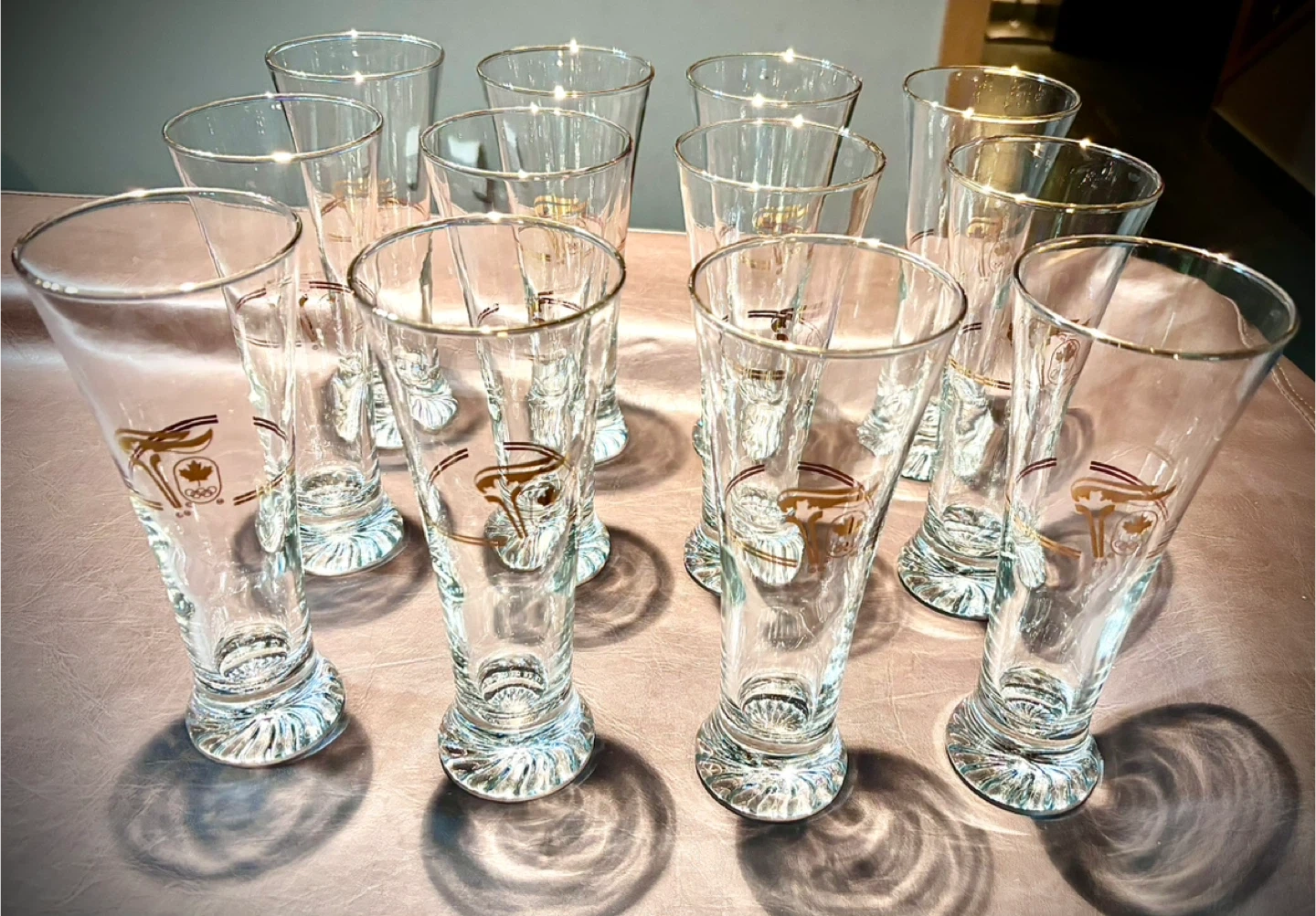 They feature a 22K Gold Rim and a gold Olympic torch logo, along with a Canadian maple leaf and Olympic rings design, which was the Olympic Logo for the 1988 Calgary Winter Olympic Games.