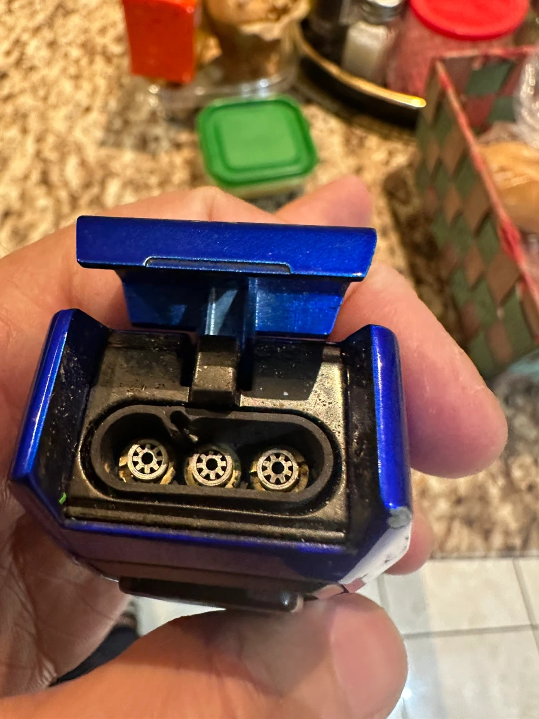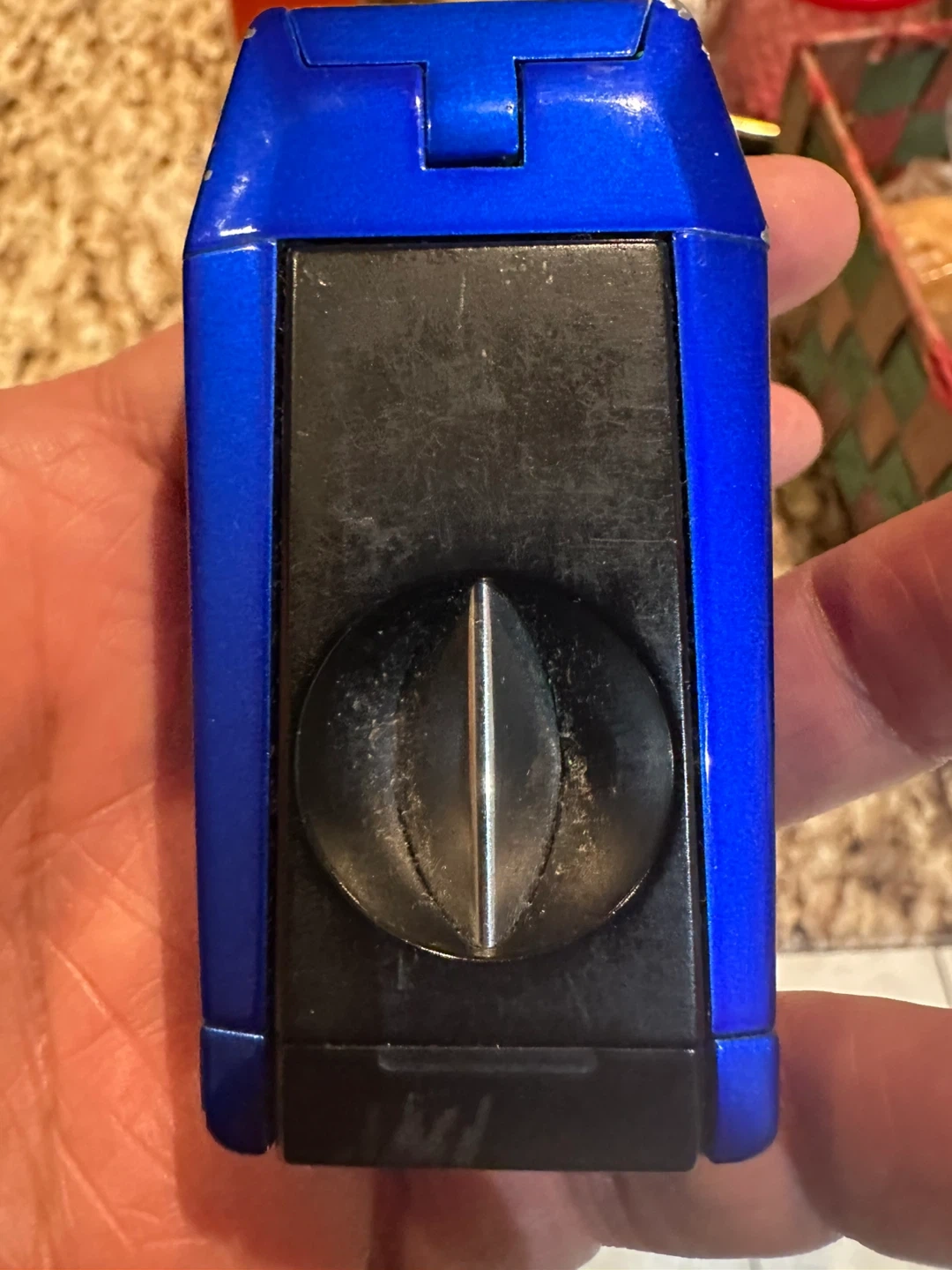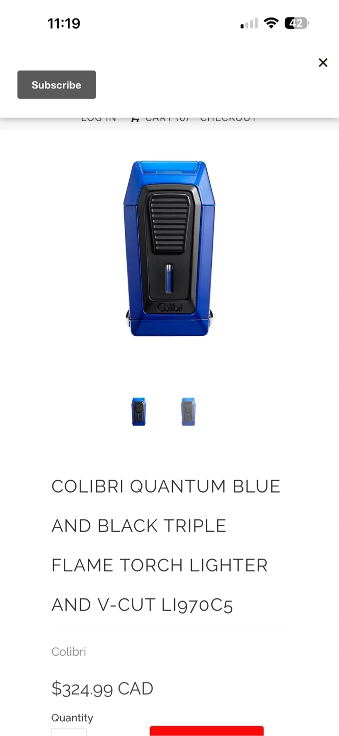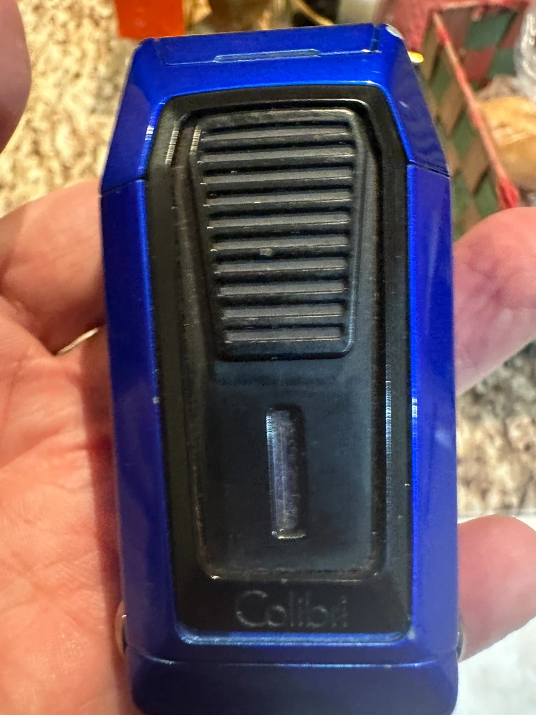 This Colibri lighter has a triple flame torch. It features a v-cut. The body is blue and black.