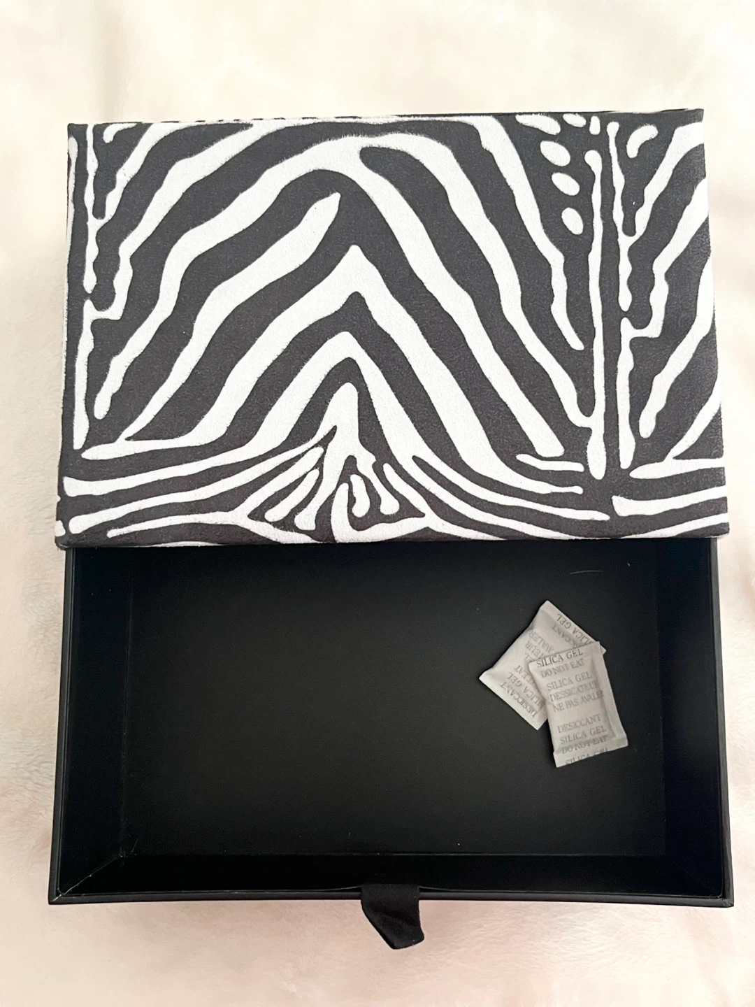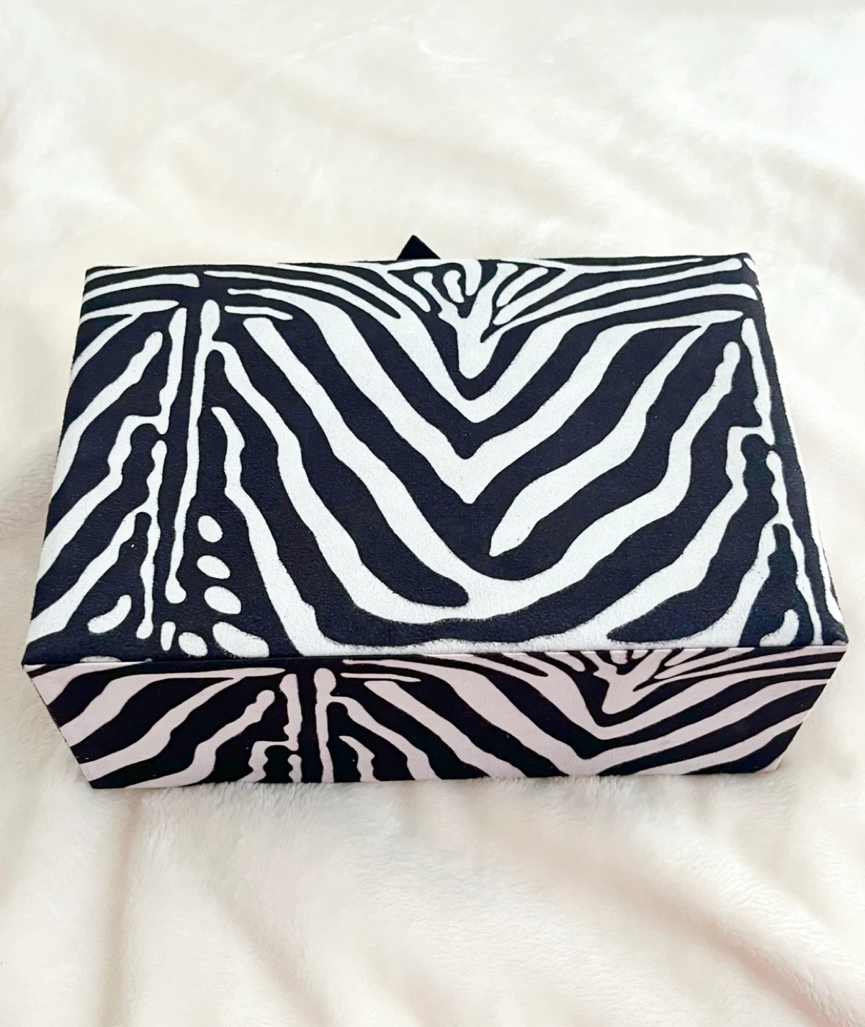 A stylish storage box featuring a bold zebra print exterior. It's perfect for organizing small items like jewelry, makeup, or office supplies. It housed a Guerlain perfume set, but I never stored anything else in it.