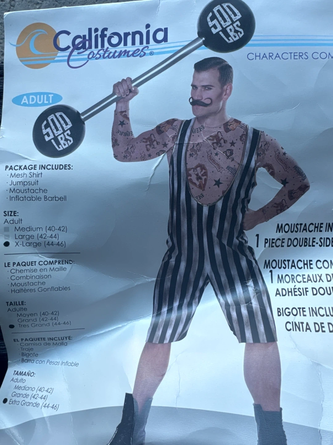 Get ready to show off your strength with this California Costumes Strongman costume! It's an adult size X-Large (44-46) and includes a mesh shirt, jumpsuit, moustache, and inflatable barbell