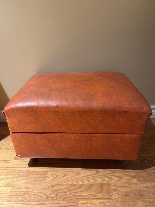This vintage orange storage ottoman is a unique and functional piece, perfect for adding a pop of colour and extra storage to any room. It's in used condition, showing some wear, which adds to its retro charm.