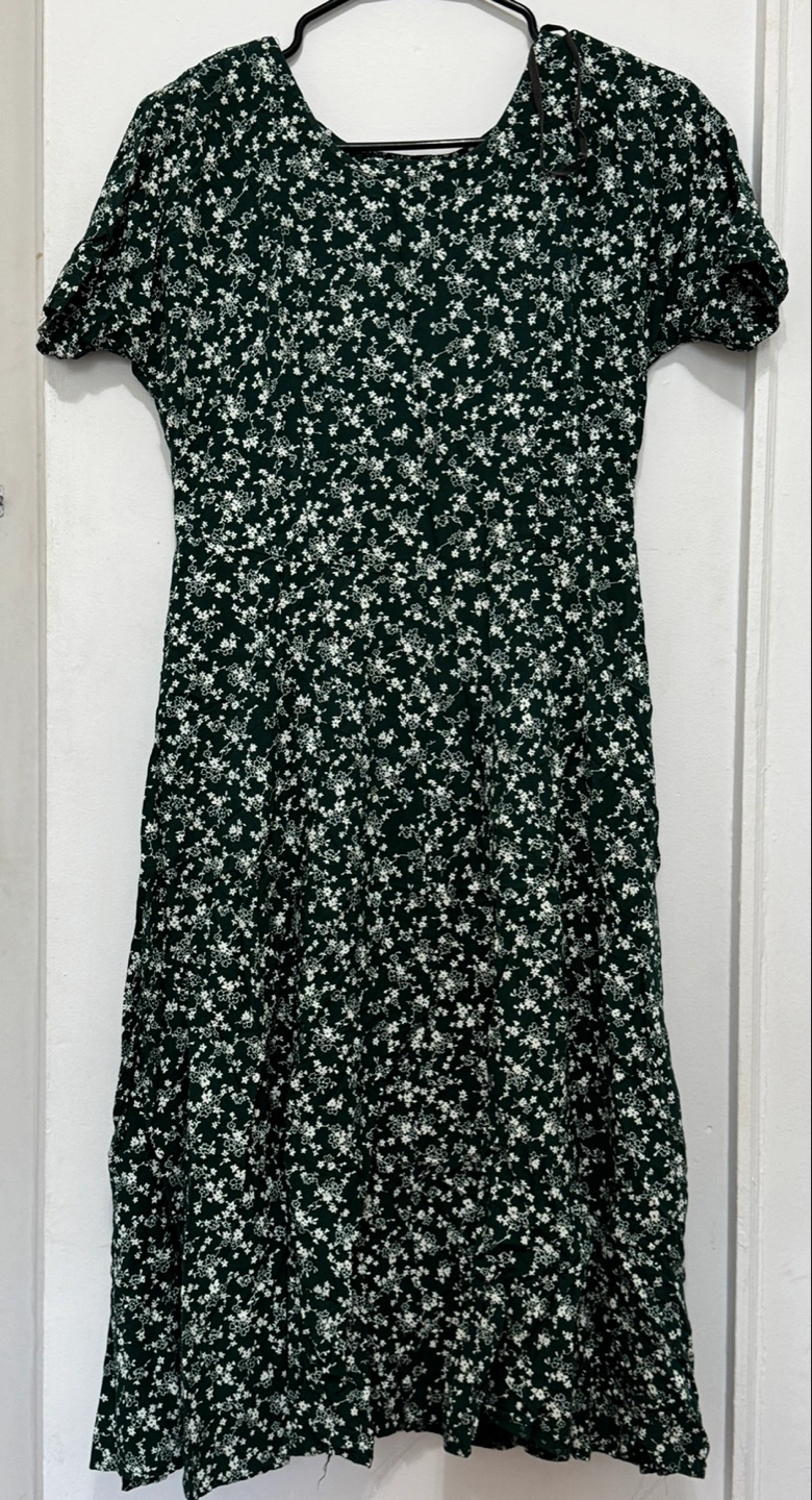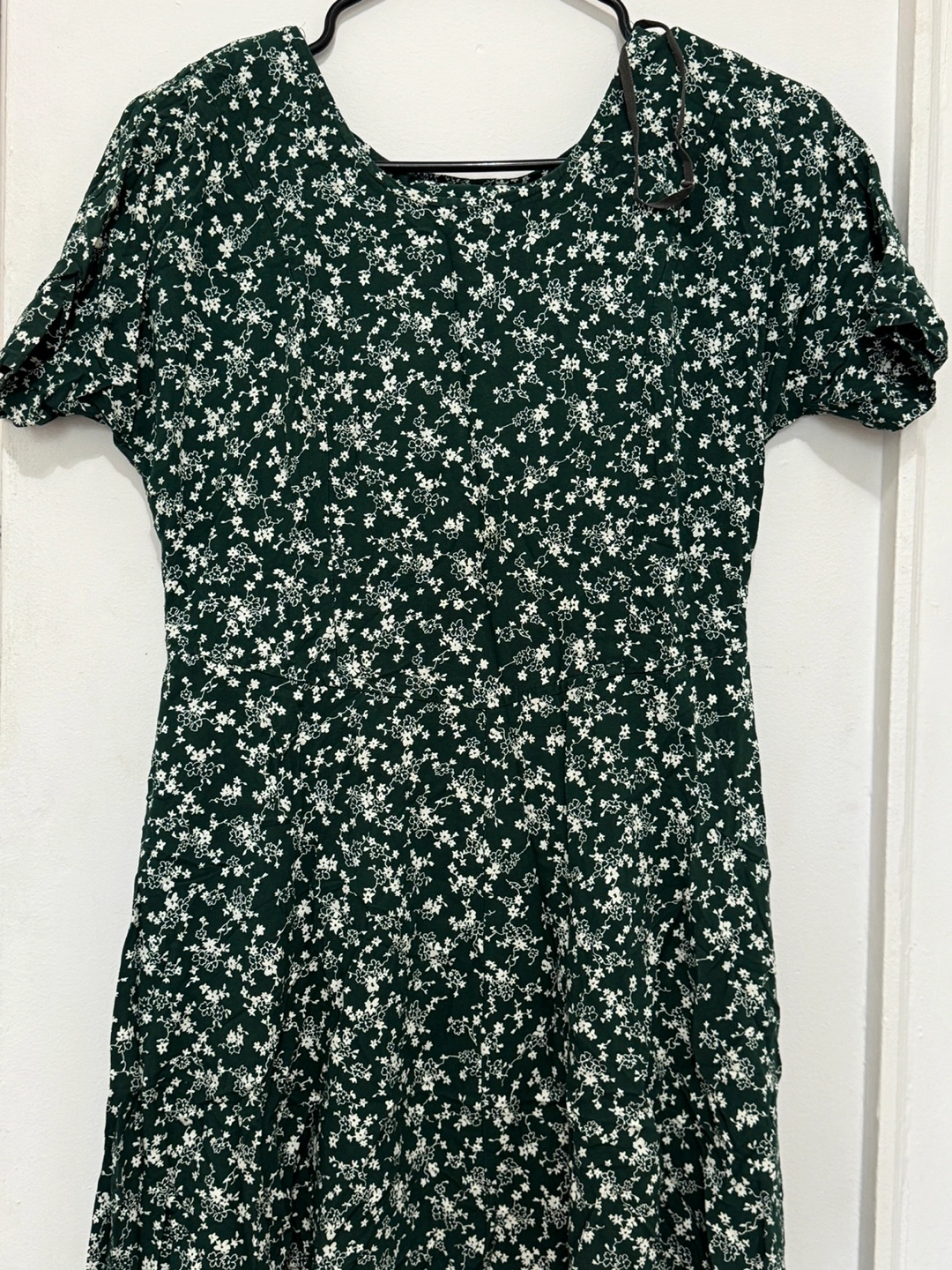 I'm selling a cute floral print dress! It features a dark green background with a white floral pattern, check last picture for the exact print and colour.