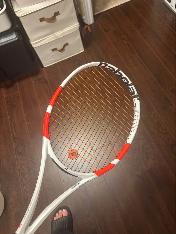 Strung with a poly/synthetic hybrid string at 56lb tension.