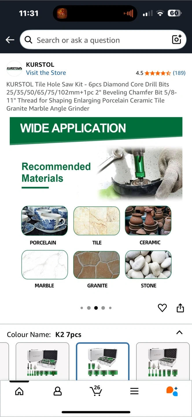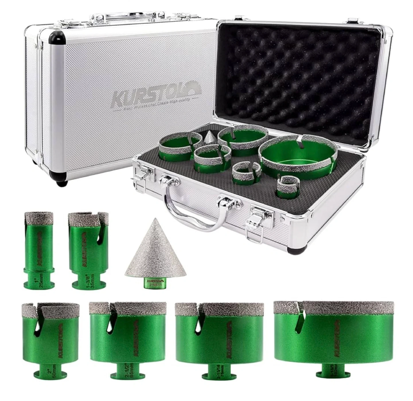 Selling a KURSTOL tile hole saw kit with 7 diamond core drill bits. Great for shaping porcelain, ceramic tile, granite, marble, and more! Includes sizes 25/35/50/65/75/102mm + one 2" beveling chamfer bit with 5/8-11" thread for shaping and enlarging