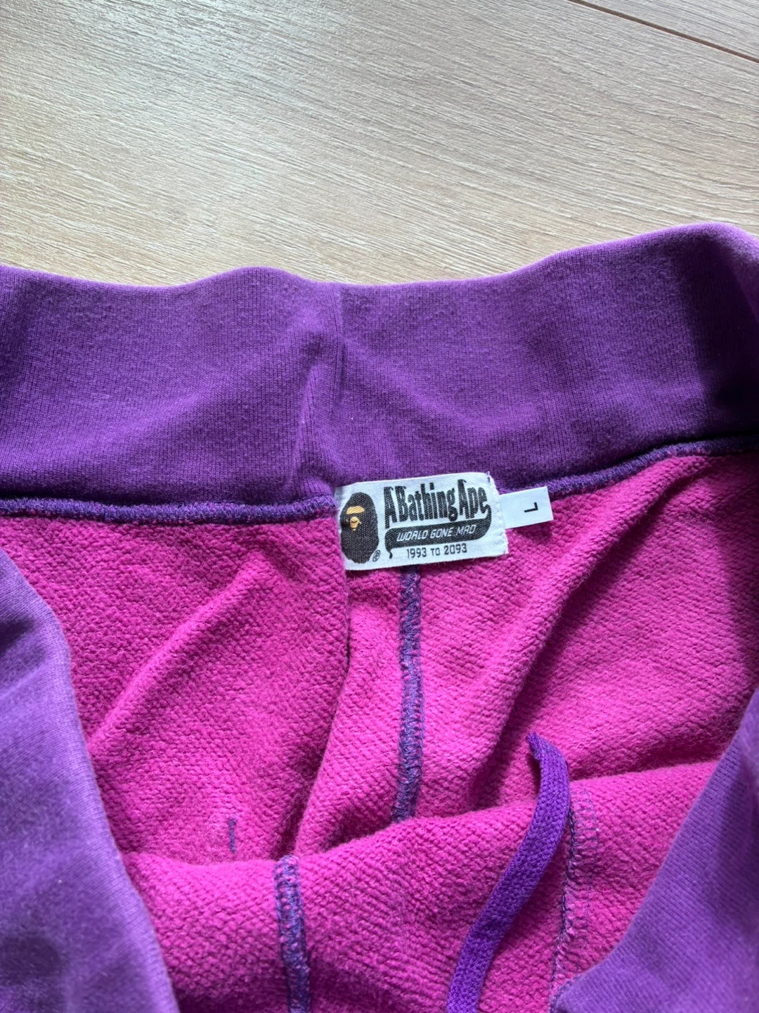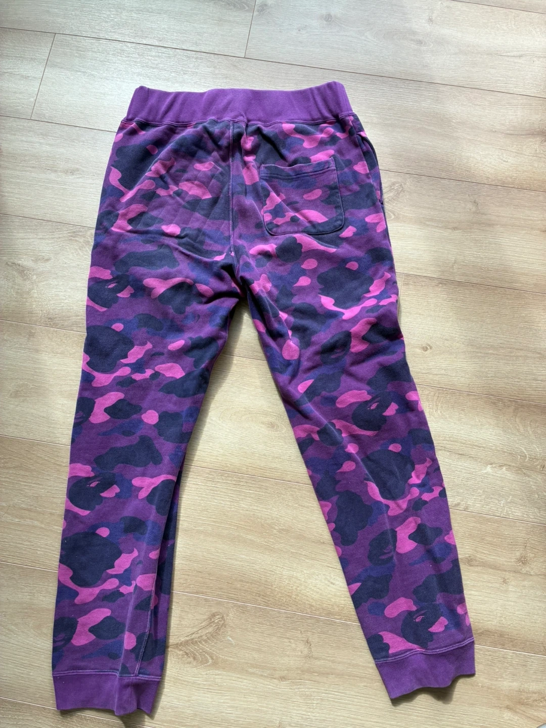 104Selling a pair of A Bathing Ape sweatpants in a purple camo pattern. They are a size L and feature the iconic BAPE shark design. Great for casual wear!