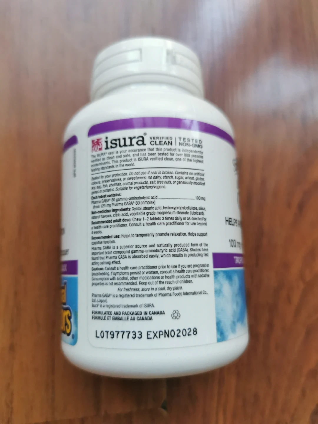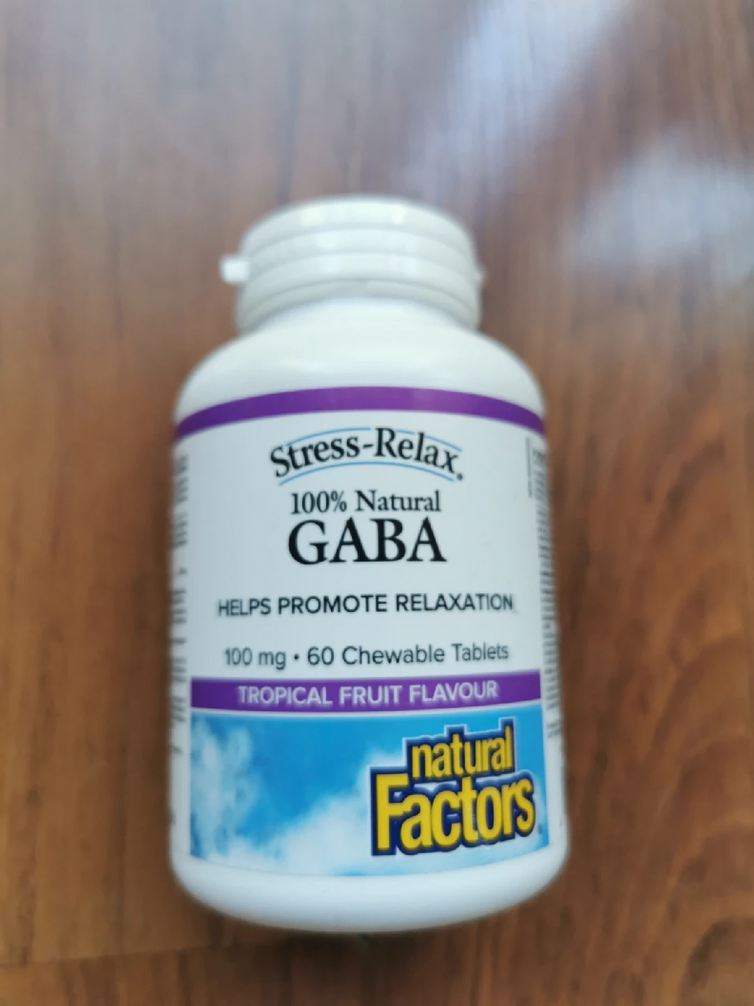 I'm selling a bottle of Natural Factors Stress-Relax GABA 100mg chewable tablets. These are tropical fruit flavour and come in a bottle of 60 tablets. They help promote relaxation and are 100% natural. The expiration date is November 2028.