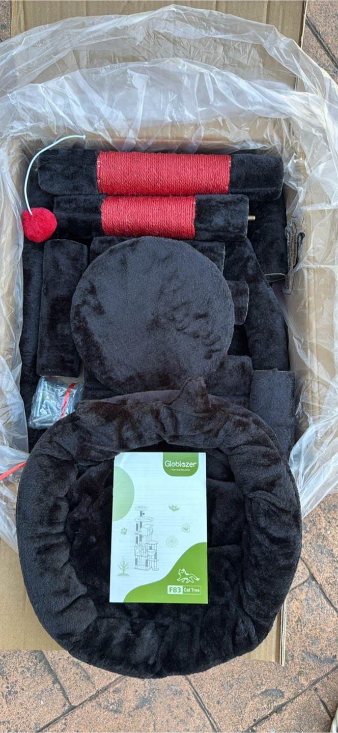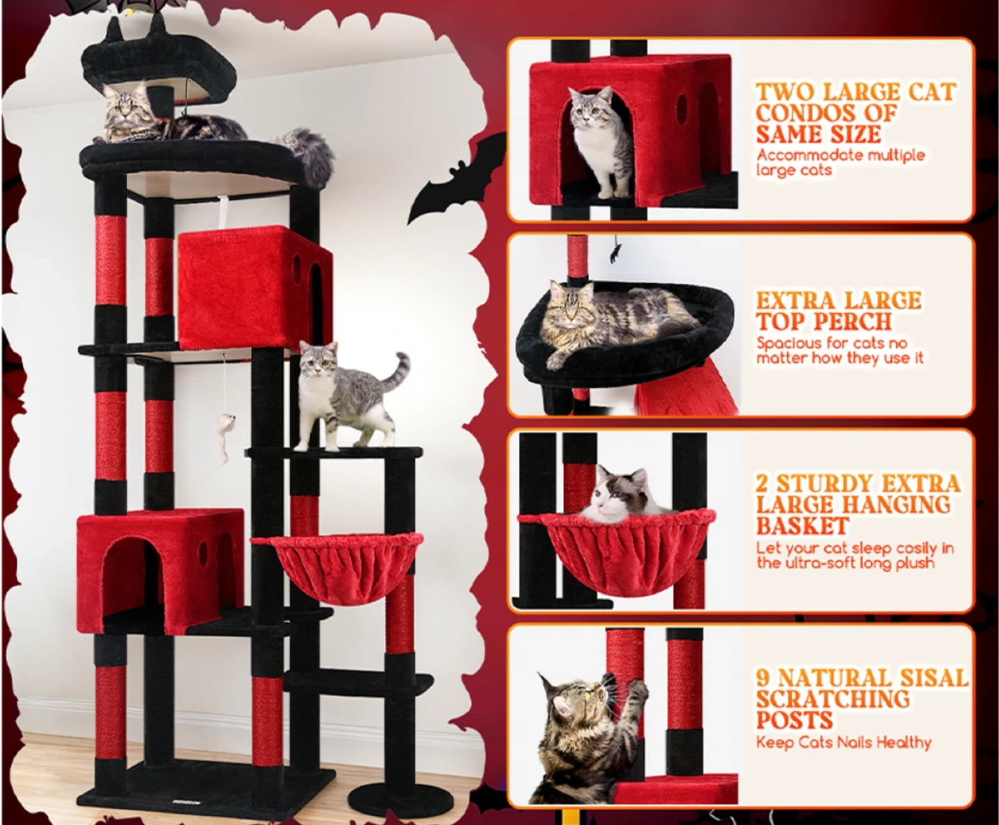 • Features: 2 spacious cat houses, multiple platforms for climbing and lounging, cozy hammock, scratching posts, and hanging toys.