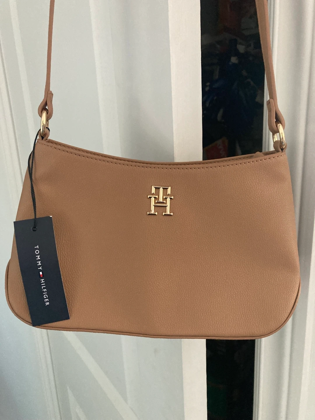 This Tommy Hilfiger shoulder bag is brand new! It's a stylish and versatile bag, perfect for everyday use. The original tag shows it was $99.50. It also comes with a cute matching card holder!