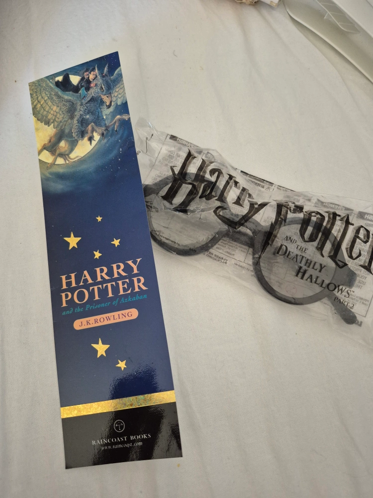 Selling a pair of Harry Potter glasses, still in their original packaging! these are the 3D theatre glasses for "Deathly Hallows". Also included is a bookmark for "Harry Potter and the Prisoner of Azkaban" by J.K. Rowling