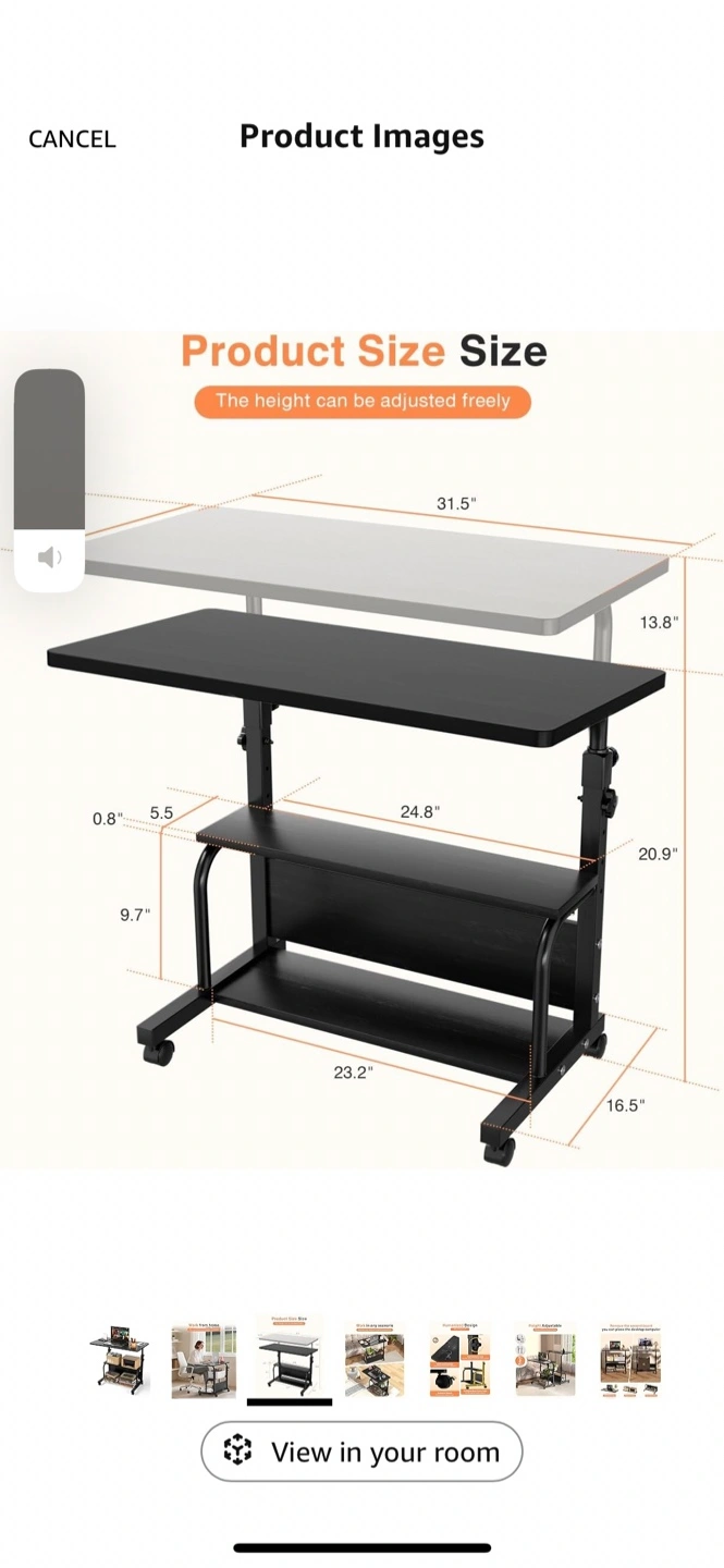 This rolling desk is perfect for small spaces! It's a standing desk with storage shelves, great for a home office or study area. The height is adjustable and it's easy to move around.