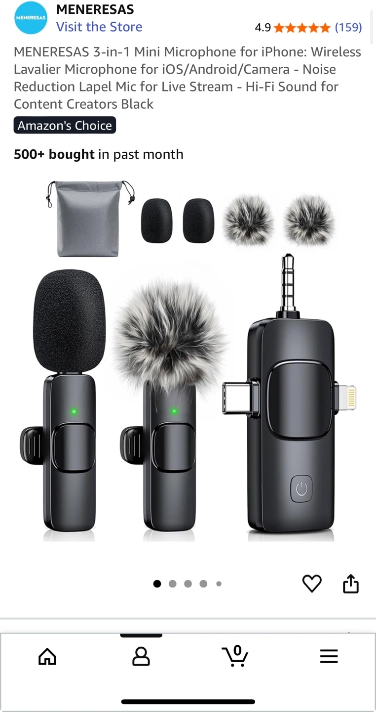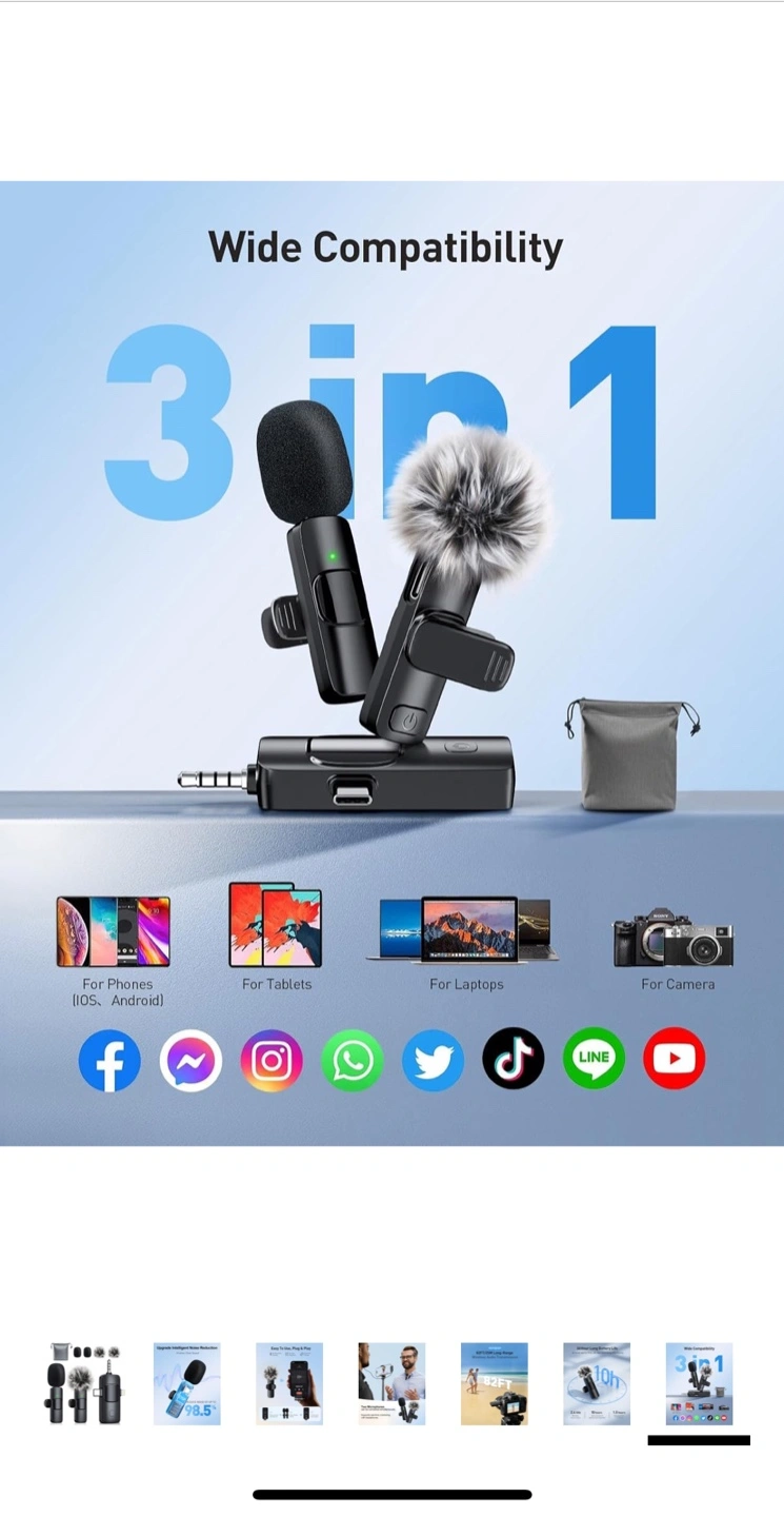 This is a MENERESAS 3-in-1 Mini Microphone for iPhone, Android, or cameras. It's a wireless lavalier lapel mic perfect for live streaming and content creation. It offers Hi-Fi sound and noise reduction. It's easy to use with a plug-and-play design, no Bluetooth or app needed, and automatic pairing. It upgrades intelligent noise reduction by up to 98.5%. Originally bought for $59.98, now selling for less!