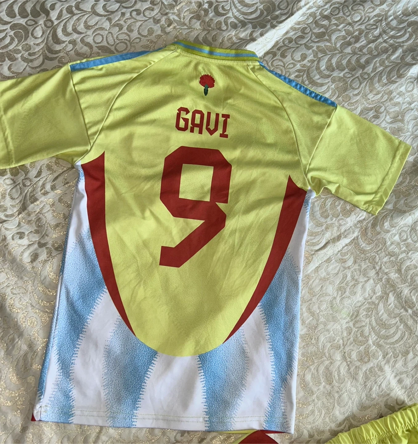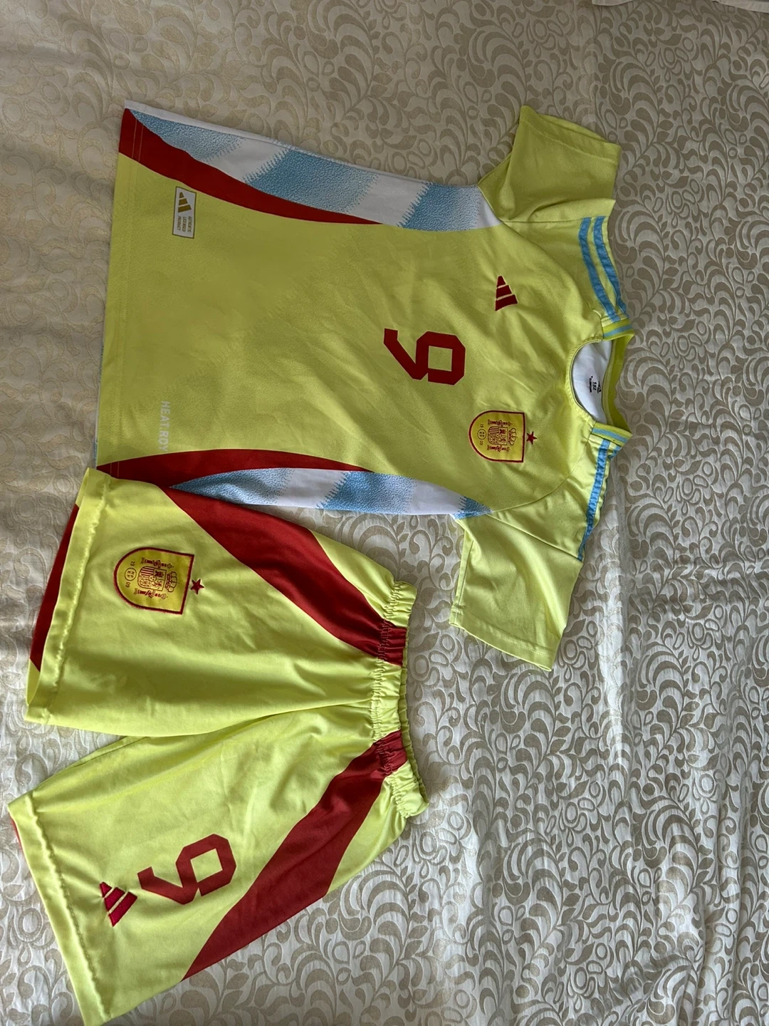 Selling an Adidas Spain soccer jersey and shorts set, featuring Gavi's #9. The size is 152. Great for any young soccer fan! Size 8- 10