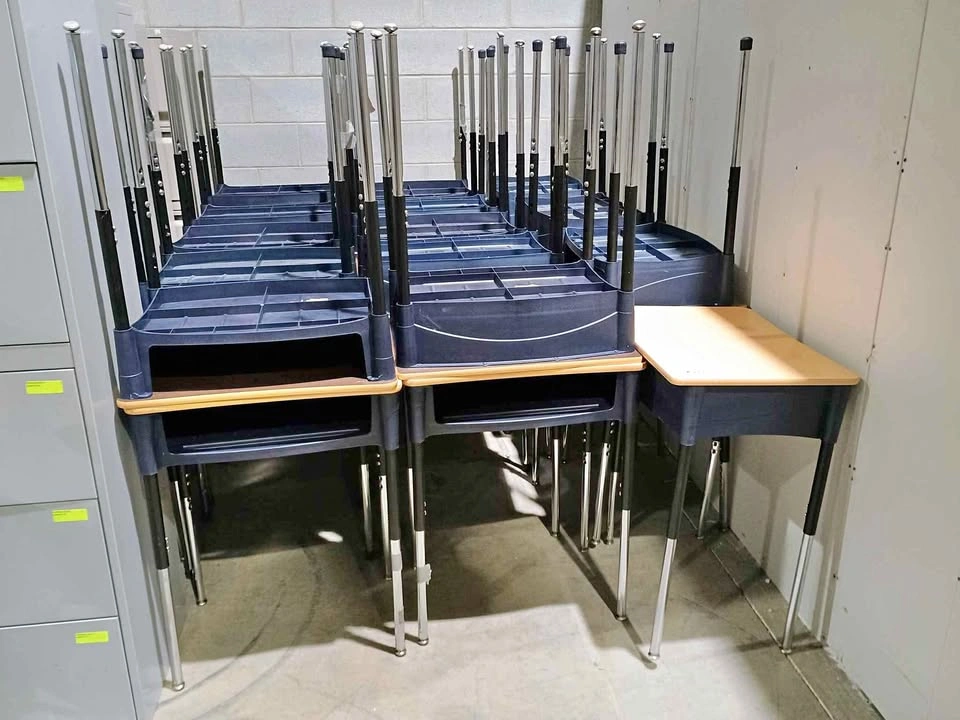 In good condition. Height adjustable. Desk tops measure approximately 24" x 18".