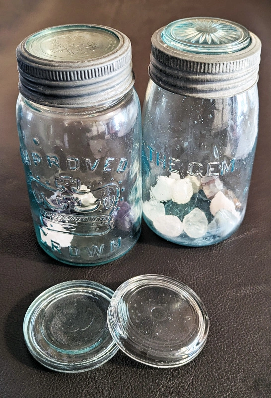 If you are seeing this Ad, then this item is still available This sale is for 2 very nice Vintage Glass Canning Jar Lid - Early Crown. Note: Jars in photo are for demonstration only and not for sale Glass canning jar lids play a crucial role in preserving and storing food. They are essential components for mason jars, ensuring the freshness and longevity of homemade jams, pickles, and other preserved foods. Pick-up in Pickering ONLY This item comes from a smoke-free home.