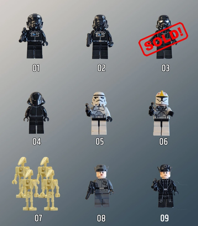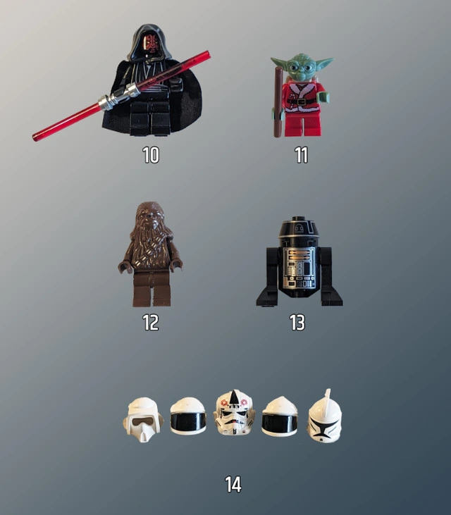 If you are seeing this Ad, then these items are still available This sale is for some very nice and clean previously enjoyed original LEGO Star Wars Minifigures. All prices are firm and as marked. Photos are of actual minifigures you will get. Lego Star Wars is based on the Star Wars saga and franchise. The product line directly focuses on the Star Wars characters from the films and TV Series, with the exception of a few special characters. • 1 LEGO Star Wars SW0268 TIE Defender Pilot Minifigure with Gun - $15 • 2 LEGO Star Wars SW0268 TIE Defender Pilot Minifigure with Gun - $15 • 3 LEGO Star Wars Shadow Trooper Minifigure with Gun - SOLD • 4 LEGO Star Wars Death Star Operator Minifigure - $15 • 5 LEGO Star Wars Storm Trooper with Gun - $20 • 6 LEGO Star Wars SW0355 Clone Trooper Pilot (Phase 1) - Yellow Markings, Black Head - $25 • 7 4 x LEGO Star Wars SW0001C Battle Droids - Tan, Bent Arm and Straight Arm - $20 • 8 LEGO Star Wars SW0665 First Order Officer (Lieutenant / Captain) - Female with Gun - $20 • 9 LEGO Star Wars SW0662 General Hux with Cap Minifigure with Gun - $20 • 10 LEGO Star Wars SW0003 Loose Mini Figure Darth Maul With Silver Double-Sided Lightsaber - $25 • 11 LEGO Star Wars Advent Calendar Set 7958-1 Subset Day 24 - Santa Yoda with Sack and Stick - $25 • 12 LEGO Star Wars Advent Calendar Set 7958-1 Subset Day 6 - Chewbacca Minifigure - $10 • 13 LEGO Star Wars Advent Calendar Set 7958-1 Subset Day 13 - R2 Q5 - $15 • 14 LEGO Star Wars Set of 5 Imperial Helmets - $25 Pick-up in Pickering ONLY These items come from a smoke-free home.
