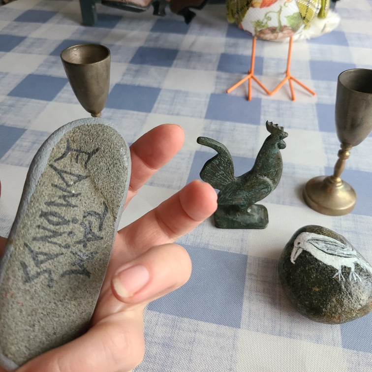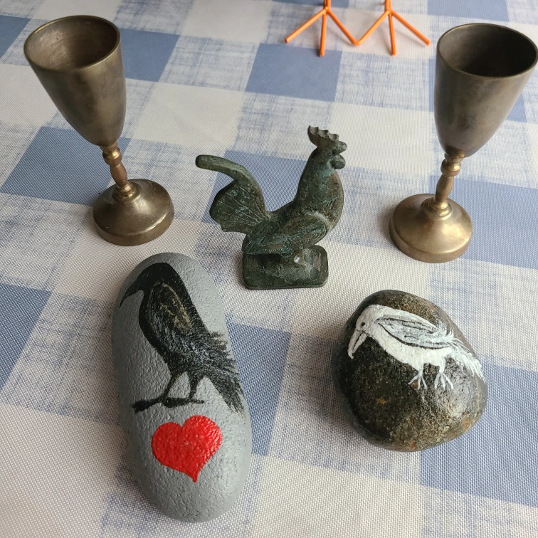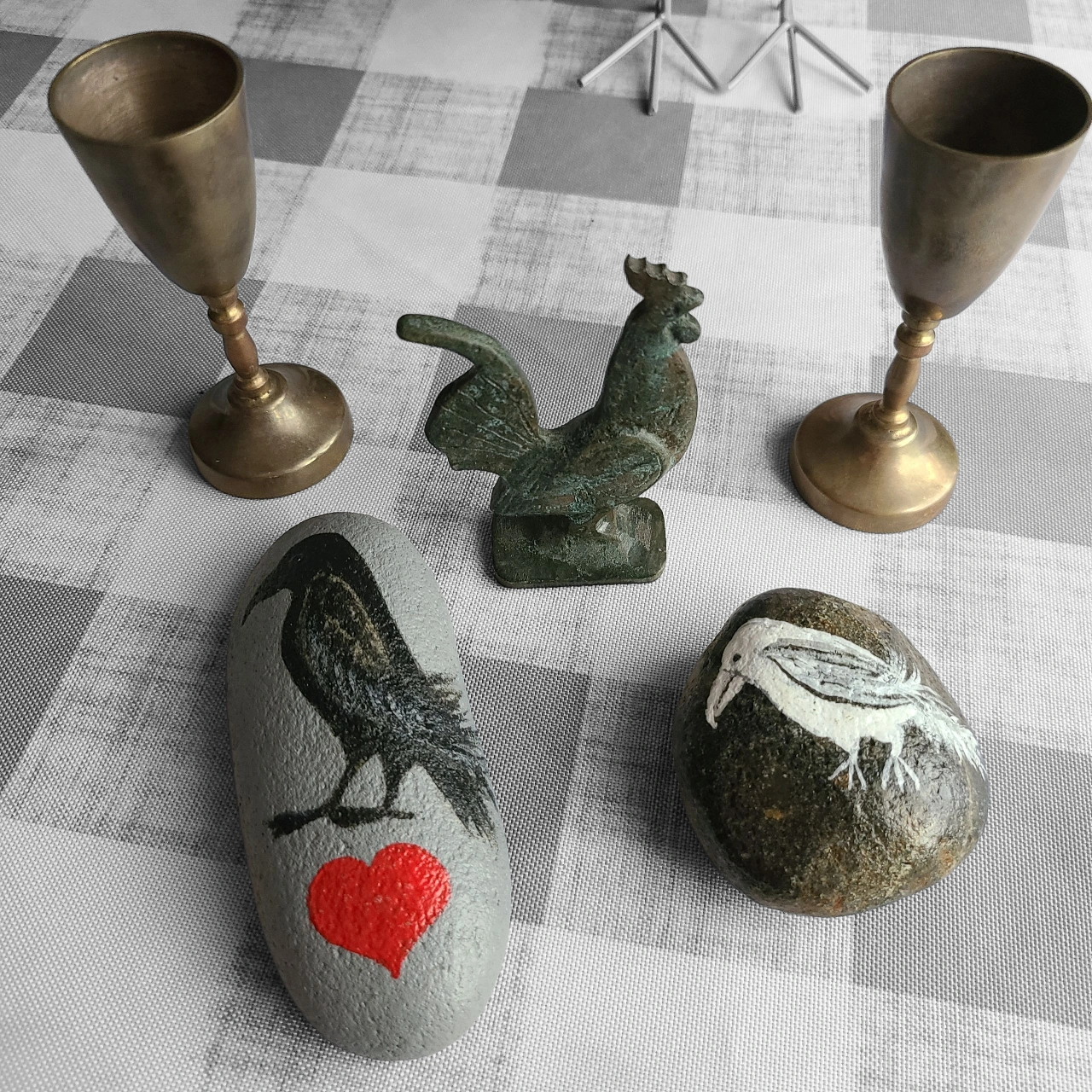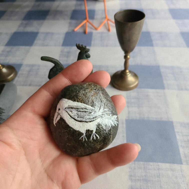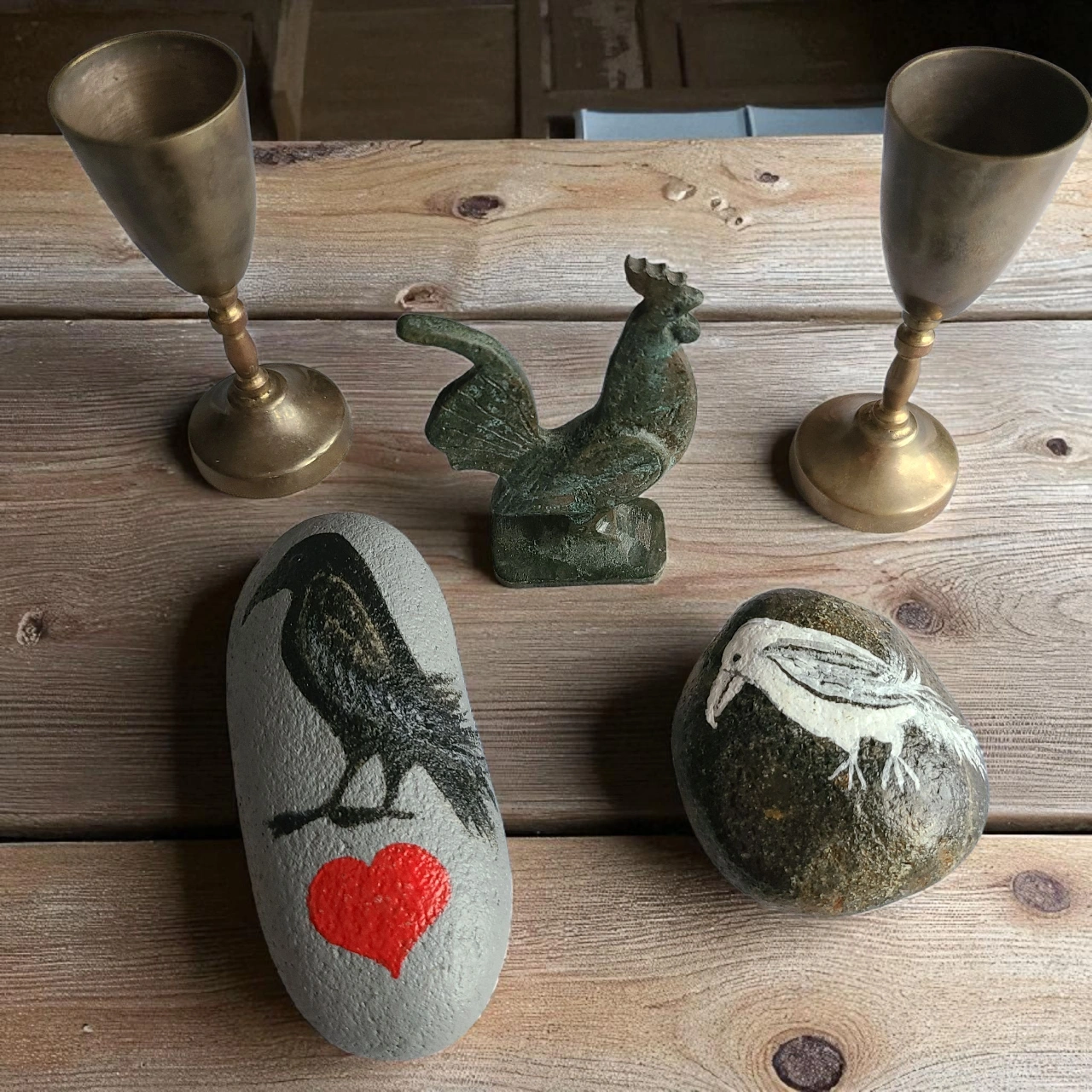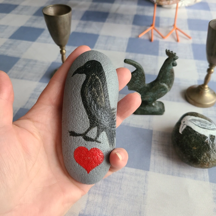 Selling some unique hand-painted rocks! Each rock features a different bird design. One has a black bird with a red heart, and the other has a white bird. They're perfect for adding a touch of art to your home or garden