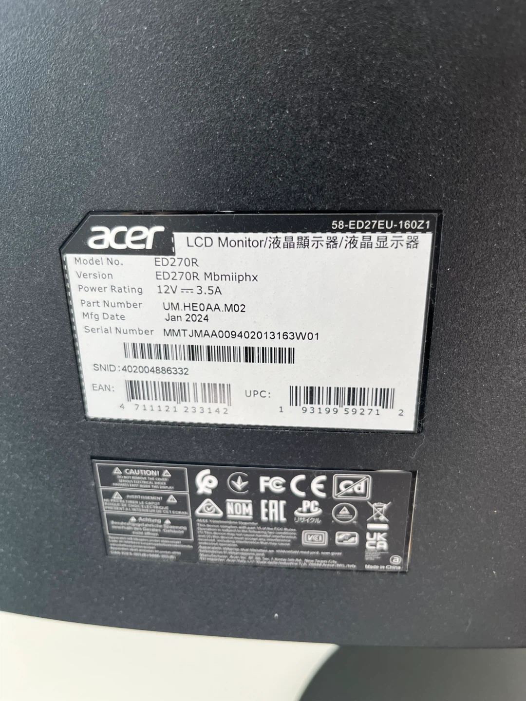 Selling an Acer ED270R LCD Monitor. It's a 27-inch curved display that would be great for gaming or general use. The model number is ED27EU-160Z1. Manufacturing date is Jan 2024