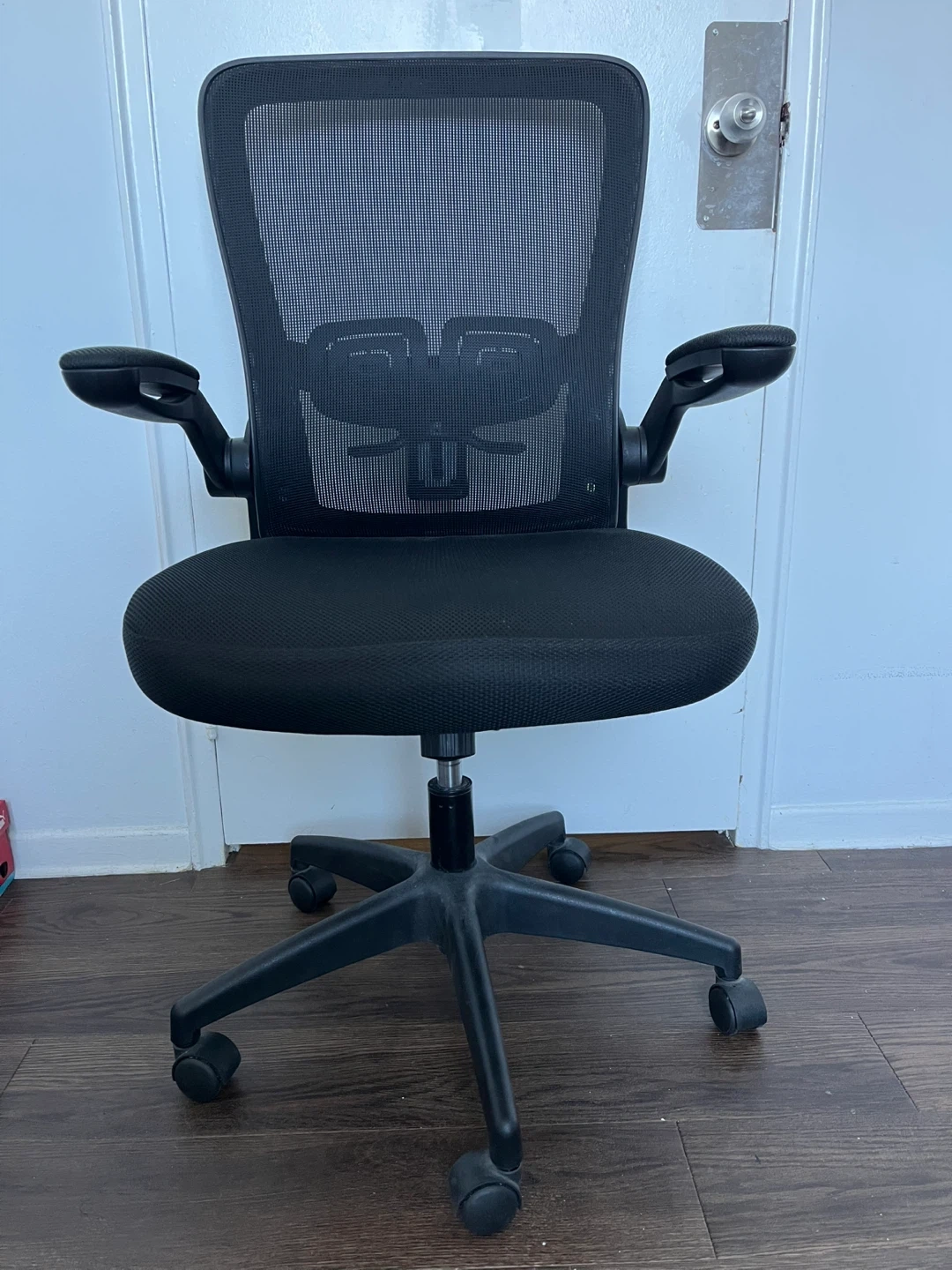 Selling a comfortable black mesh office chair. It features adjustable armrests and a sturdy base with wheels. Perfect for your home office or study space!