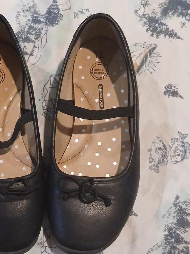 These are a pair of gently used Wonder Nation black ballet flats in a size 12. They feature a cute bow detail and a comfortable memory foam insole. Great for everyday wear!