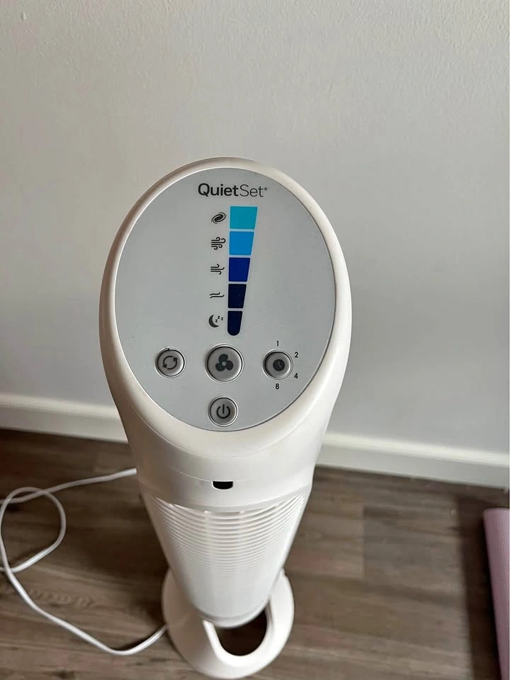 Tower fan, 1 year old. Discounted price due to clicking noise when fan rotates.