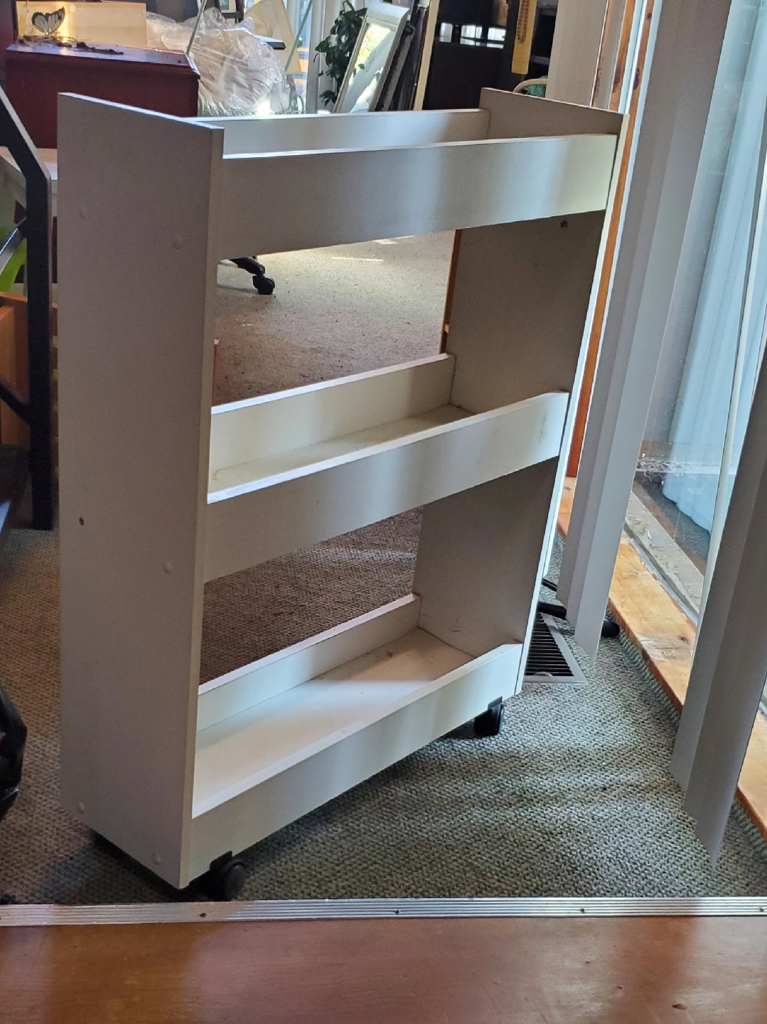 Here's a handy white rolling storage shelf! It's perfect for organizing books, toys, or anything else you need to keep tidy. The wheels make it easy to move around, and the neutral colour will fit in with any decor. Has a broken handle. Must pick up. Cash only.