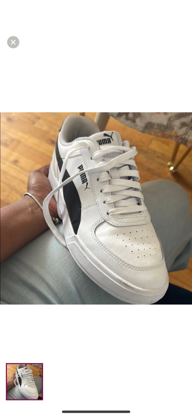 Selling a pair of Puma sneakers in white with black accents. They are in good condition and ready for a new home!