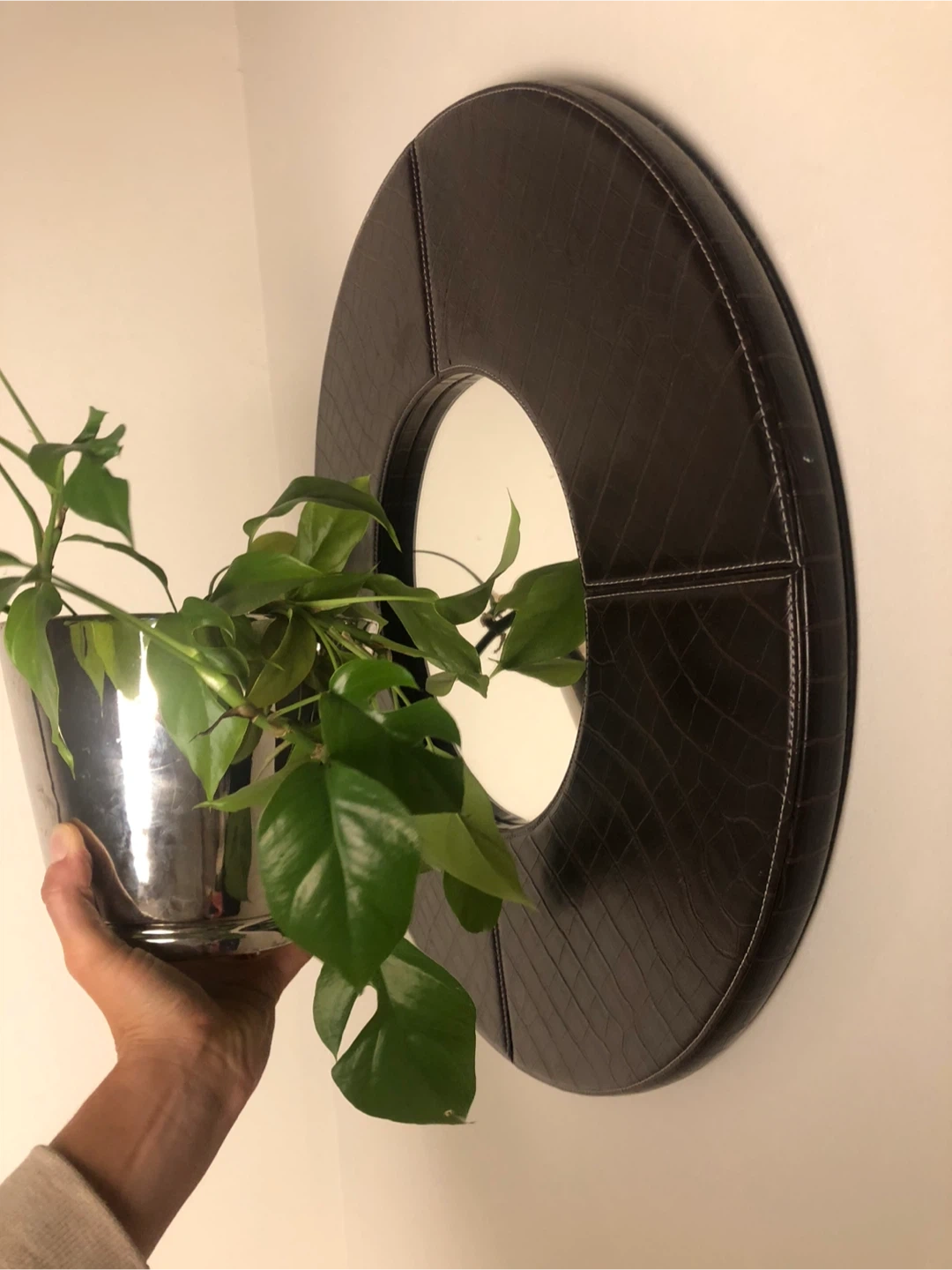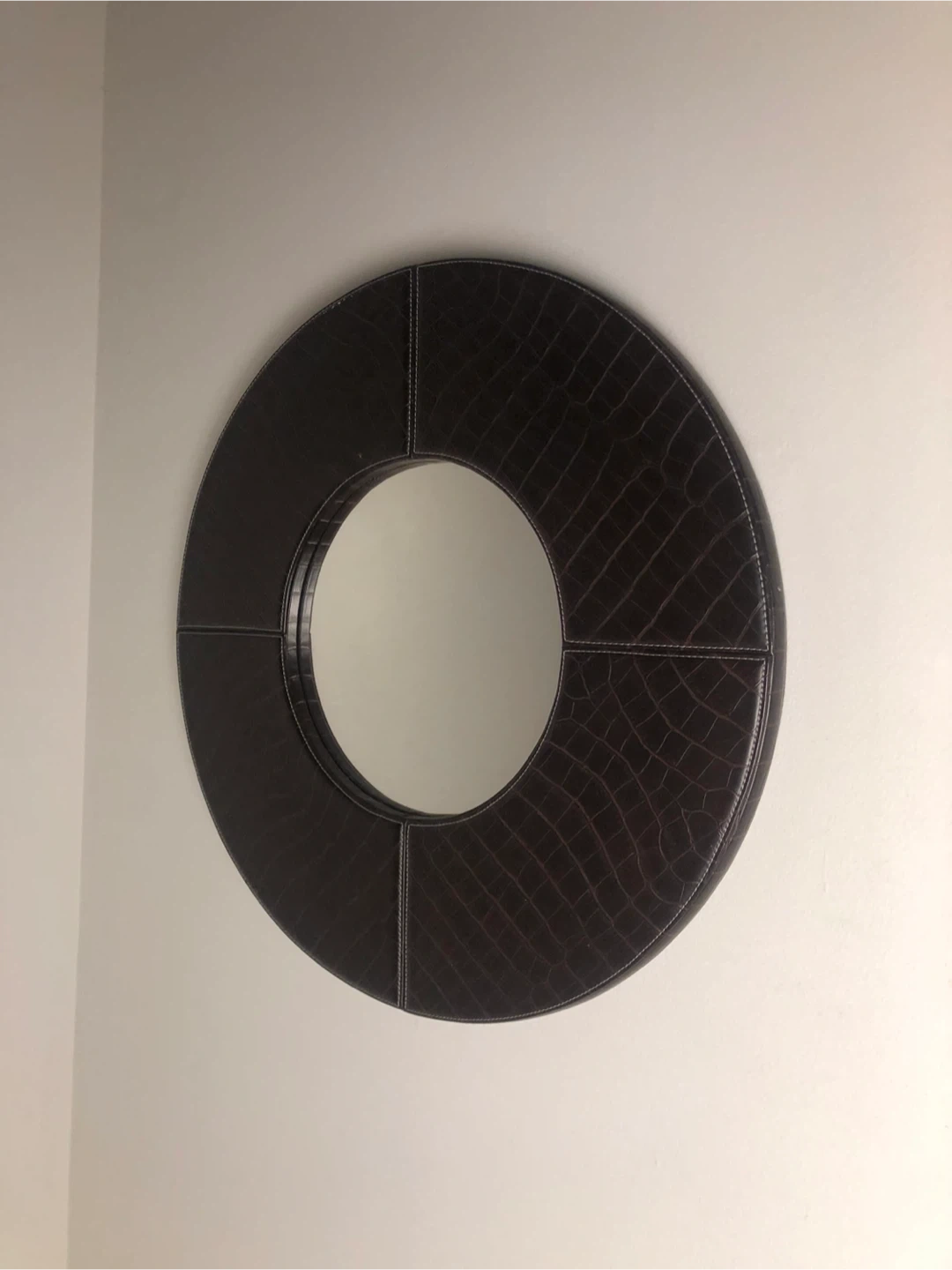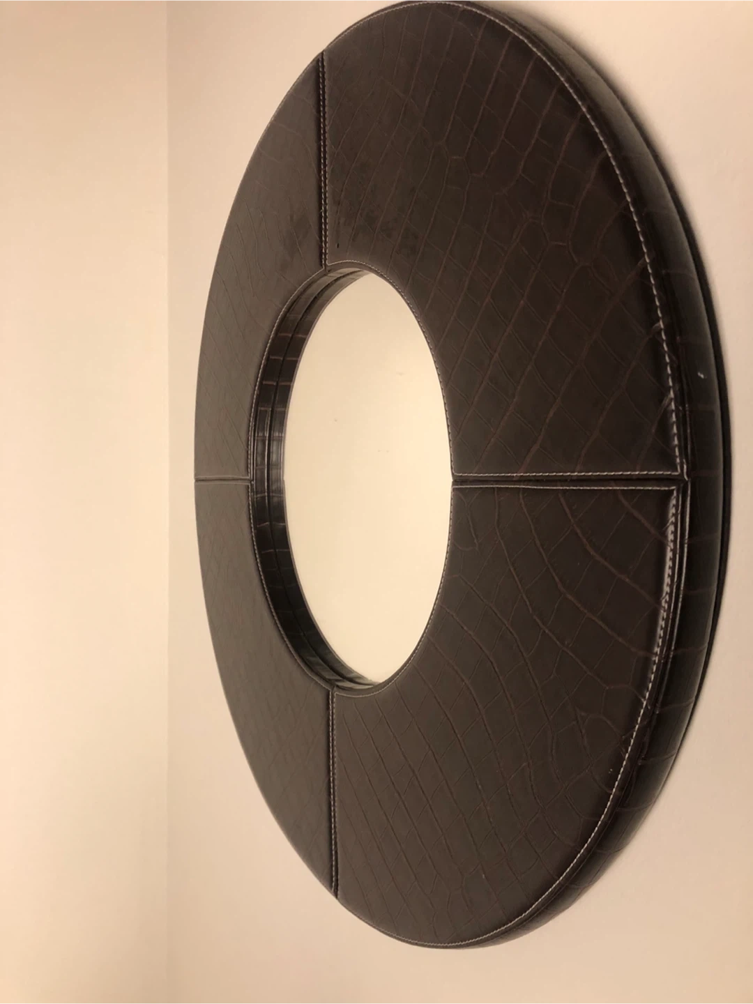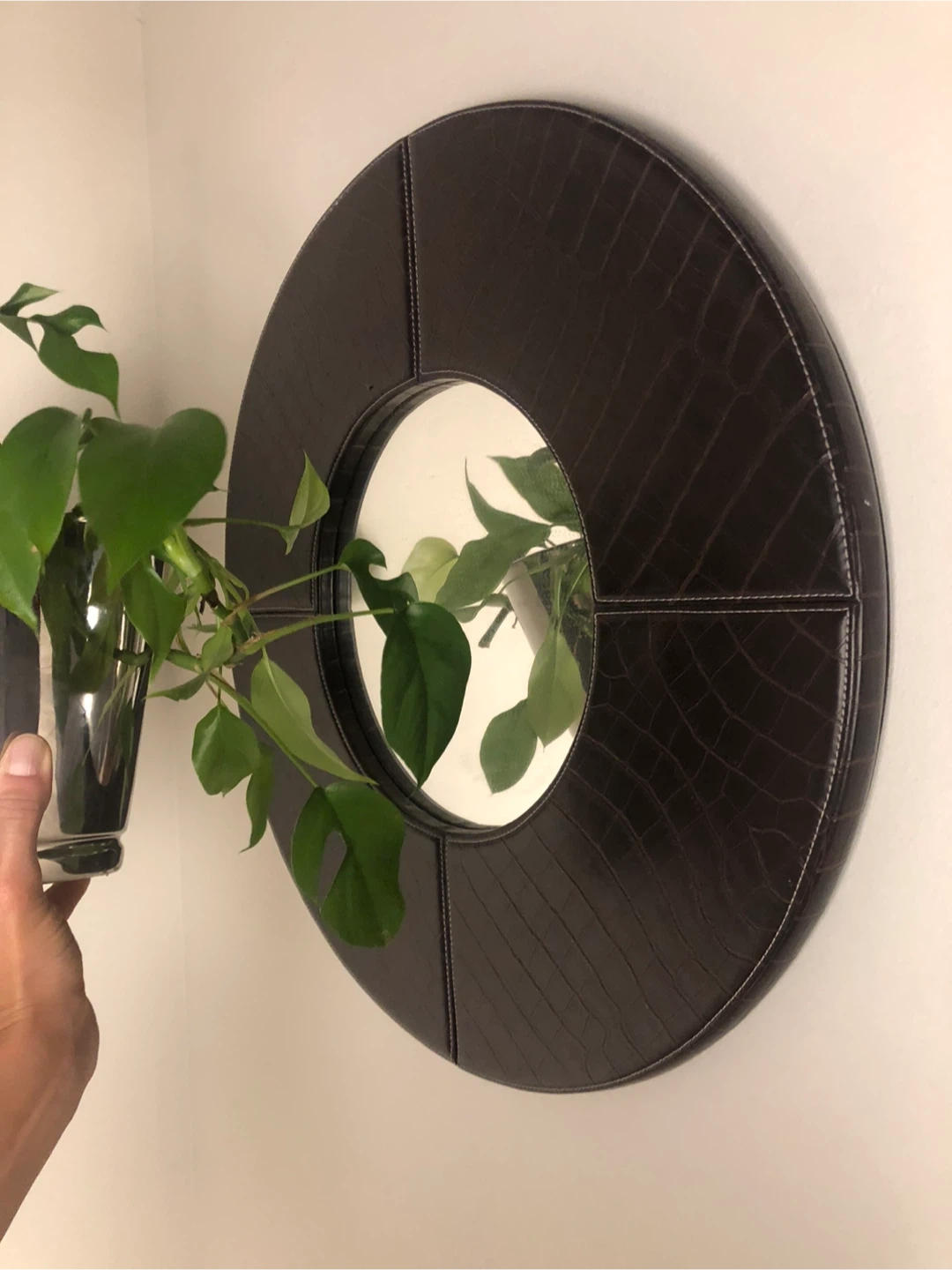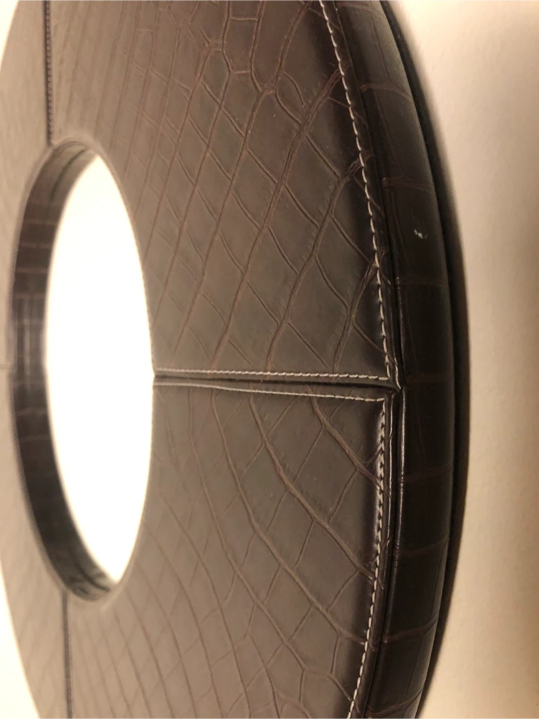 110Here's a stylish round mirror with a brown faux leather frame! It's in great shape and would look lovely in any room. The faux leather has a nice texture that adds a touch of elegance 19 inches in diameter (49 cm)