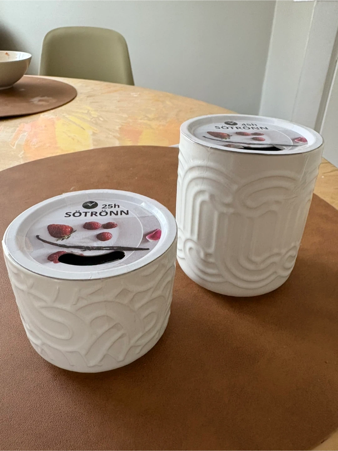 Selling a set of two unused IKEA SÖTRÖNN scented candles. One candle burns for 25 hours and the other for 45 hours. These candles have a lovely strawberry and vanilla scent and come in decorative white pattern. The candle itself is dark coloured.