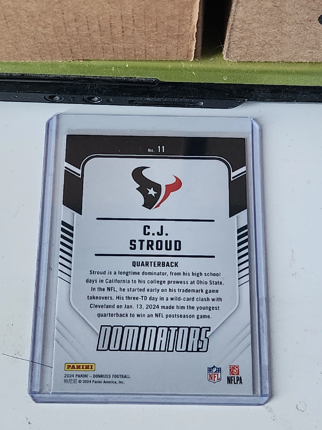 Selling a C.J. Stroud Dominators football card. It's from the 2024 Panini Donruss Football collection. Stroud is a quarterback for the Houston Texans. This card commemorates his achievements, including being the youngest quarterback to win an NFL postseason game on Jan 13, 2024