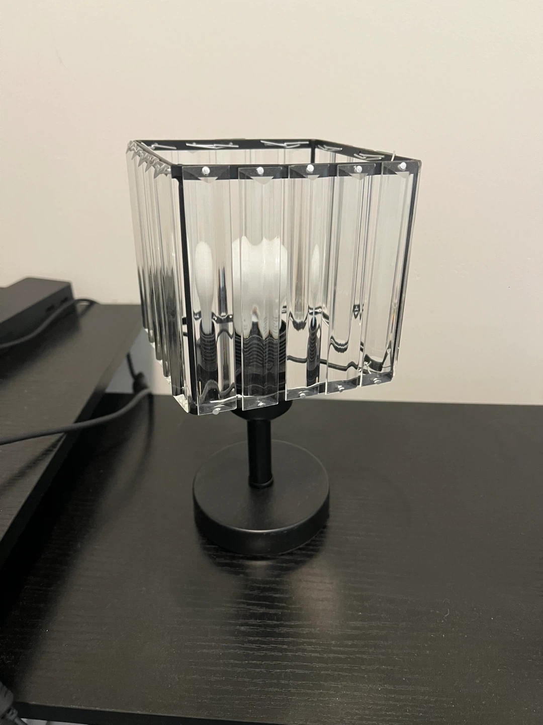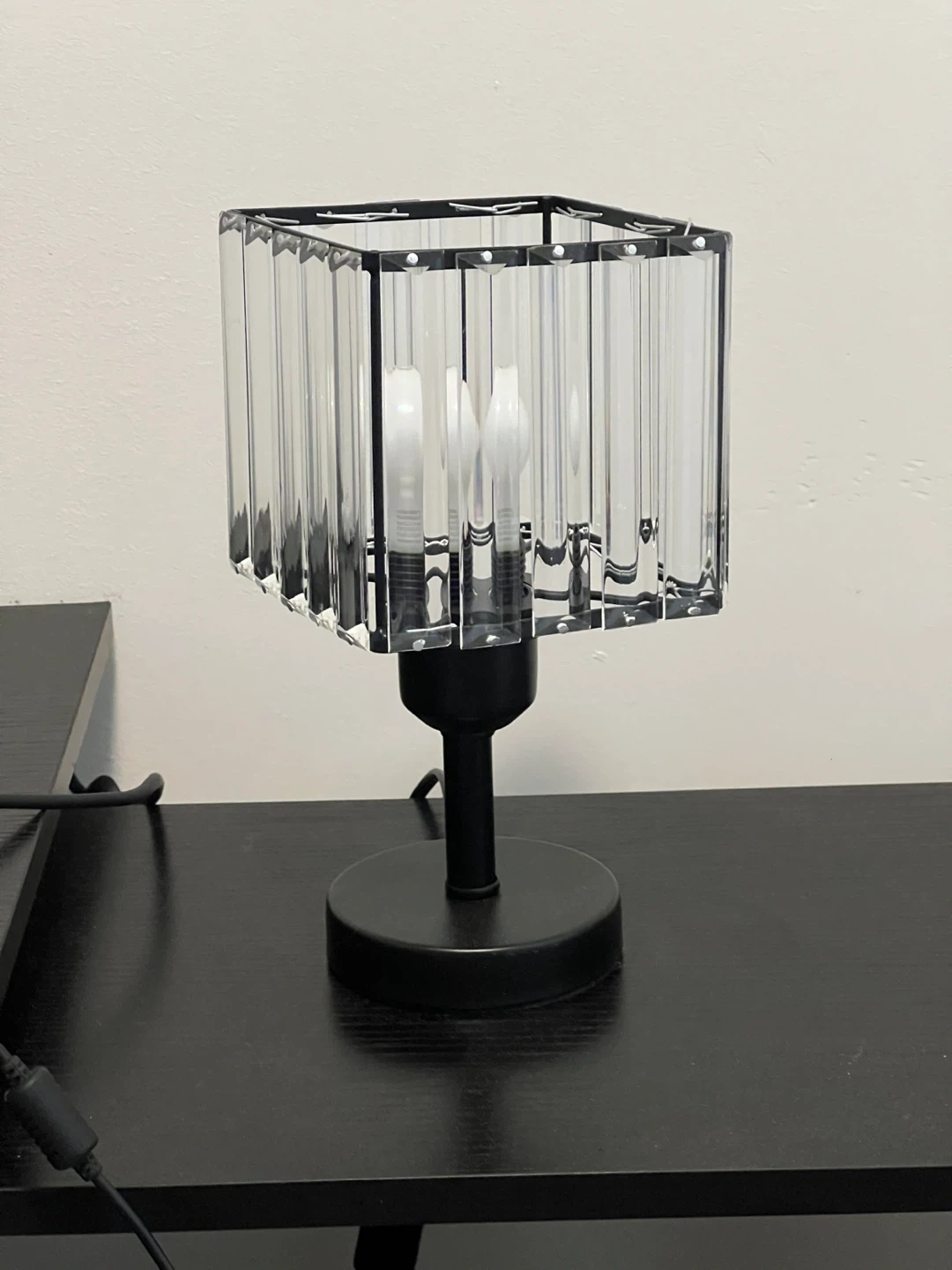 Selling a set of 2 stylish cube crystal table lamps with a sleek black base. It's in great condition and would add a touch of elegance to any room. Bulbs included. Perfect for a bedside table or desk! Must go asap, pick up from Scarborough.