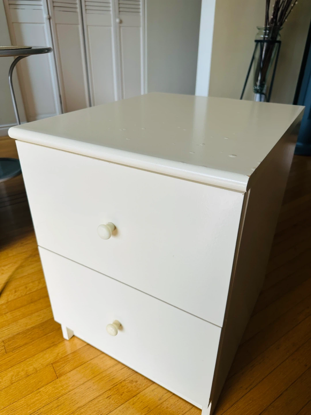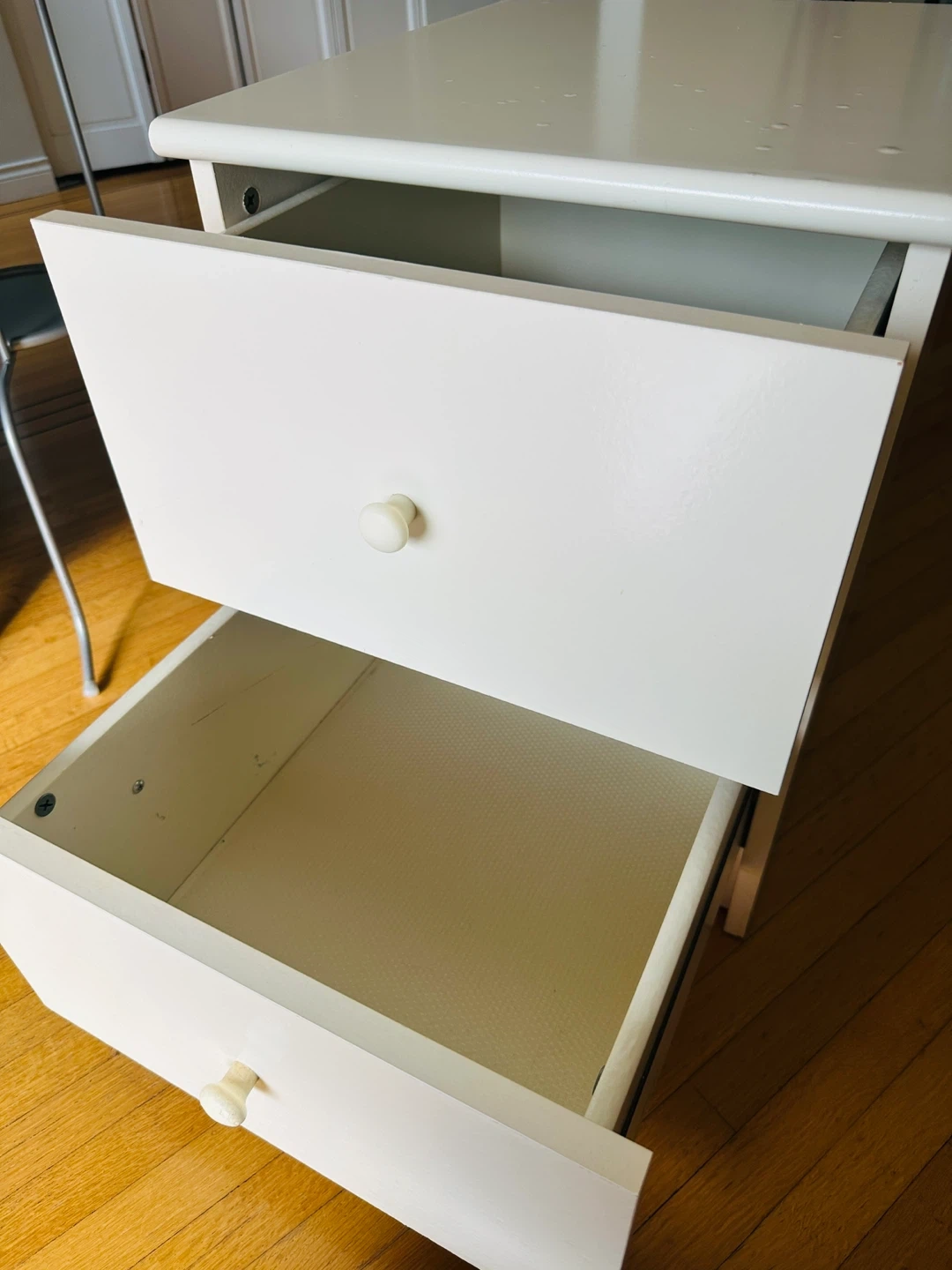 Selling a white side table with two drawers. Some signs of wear on the top surface, as shown in the photos, but full functional