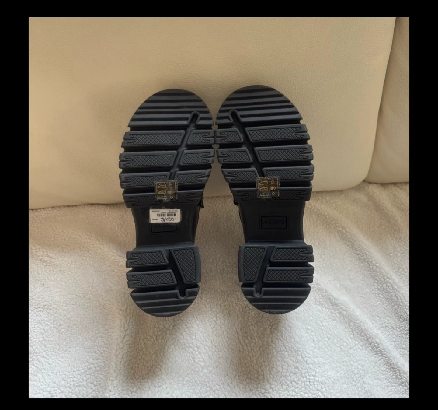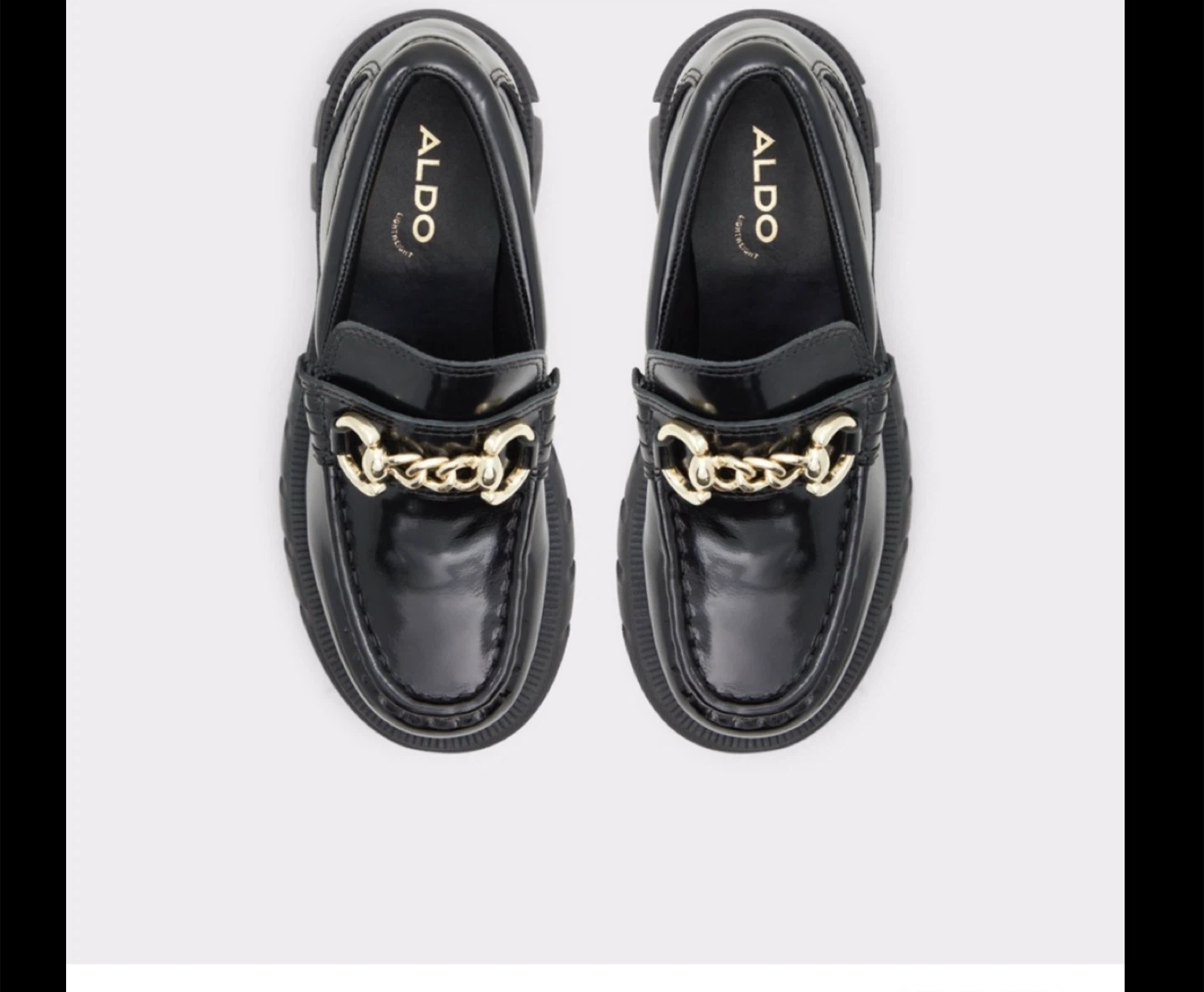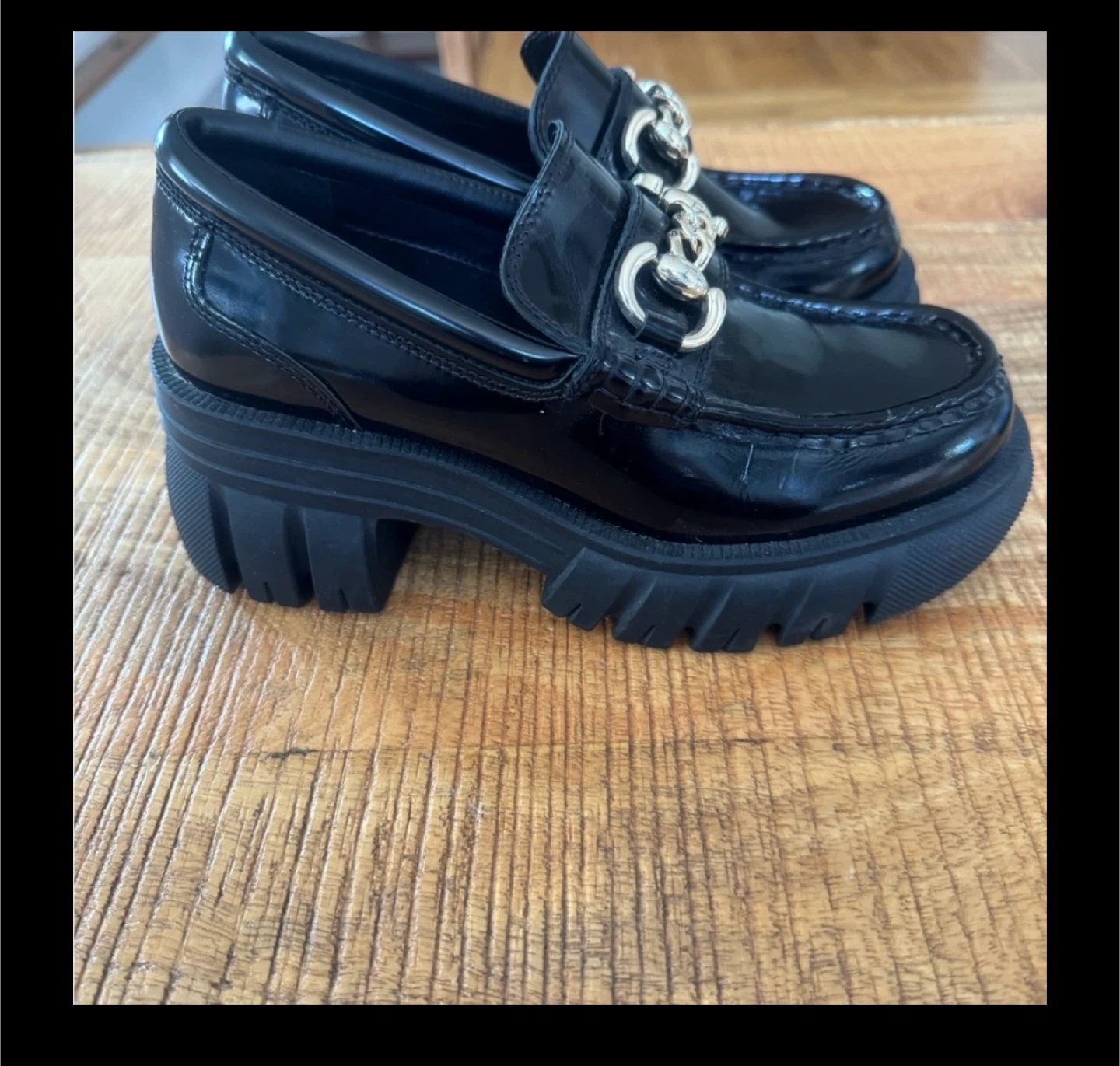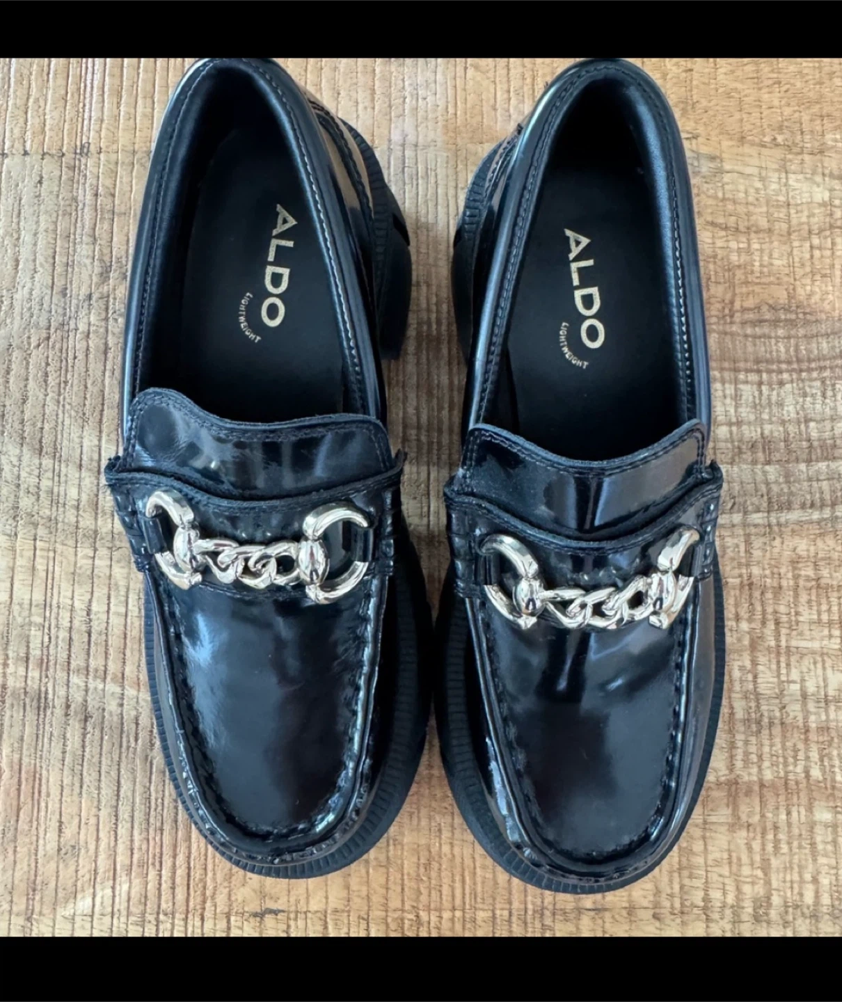 Selling a pair of ALDO loafers in black patent leather. They're a size 6 and feature a chunky platform sole and silver chain detail. They are super stylish and perfect for adding a bit of edge to any outfit! cash only and pick at Elton crescent , Etobicoke south of lakeshore