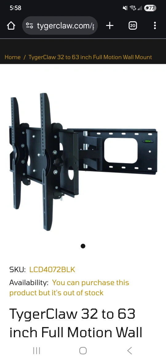 Selling a TygerClaw LCD4072BLK full-motion wall mount designed for most 32" to 63" flat-panel TVs up to 176lbs/80kgs. It offers a tilt degree from -15° to +15°, and a swivel degree up to 180°. Made from heavy gauge steel for total support and durability, it allows movement of TV up to 665mm from the wall. It also features an innovative locking mechanism for quick and easy installation. Still in box. Originally priced at $206.99