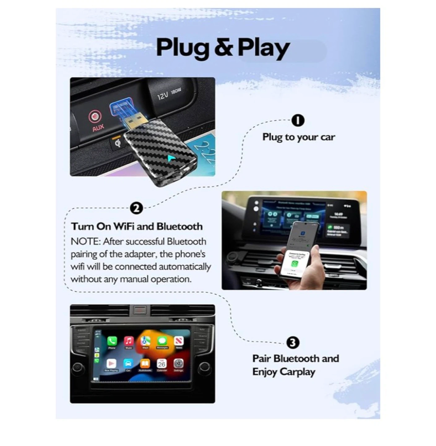This wireless CarPlay adapter features a sleek carbon fiber-style design. It's stylish, lightweight, and about half the size of other adapters. Say goodbye to cable clutter with this compact adapter!