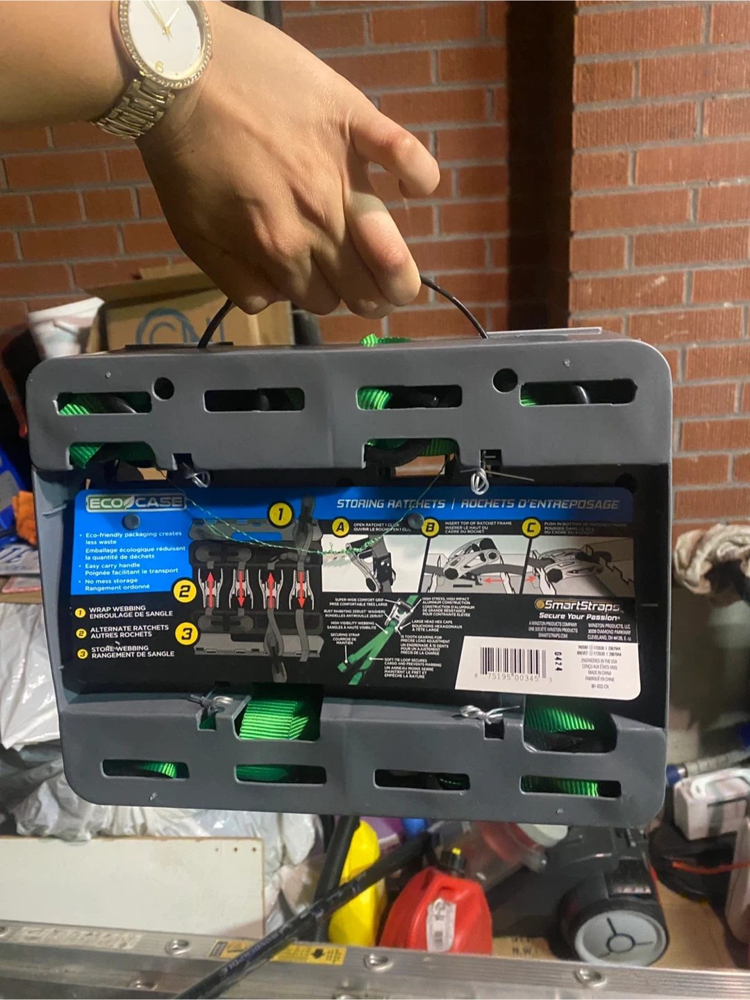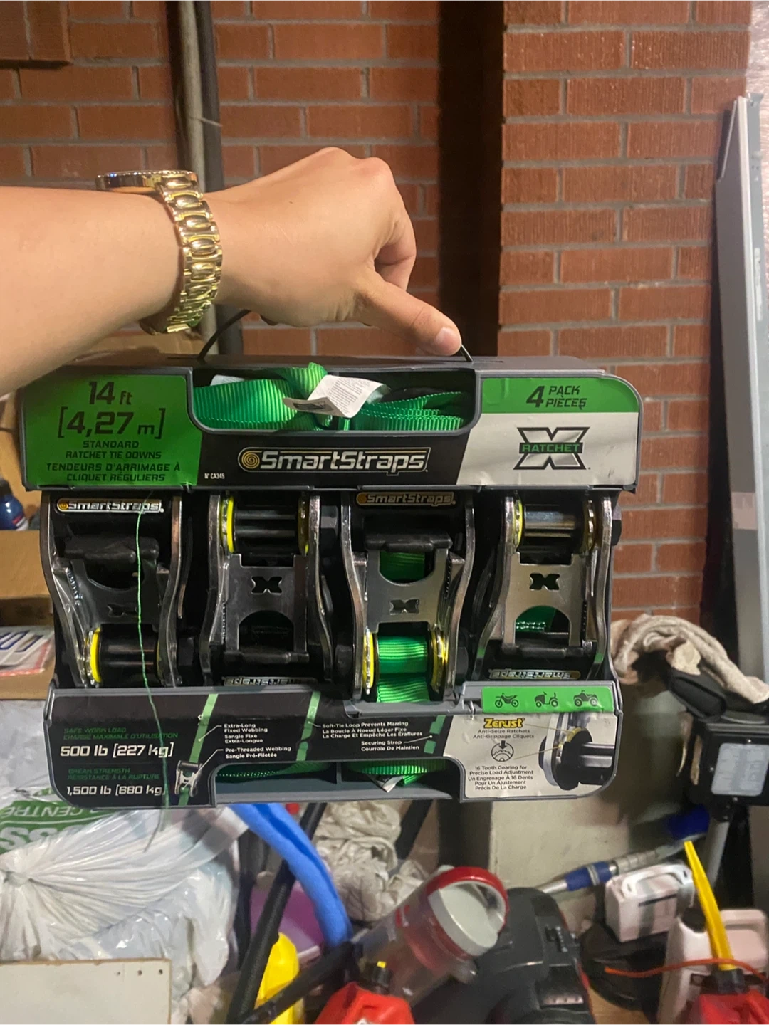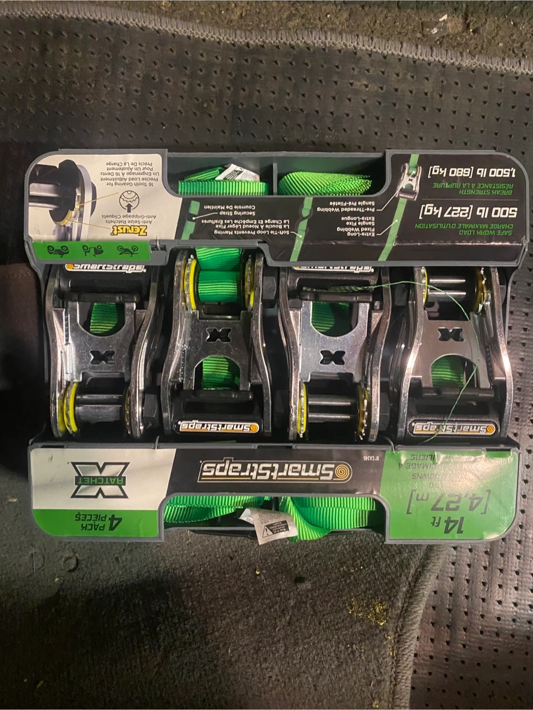 Selling a set of SmartStraps ratchet tie downs. This is a 4-piece set, each strap measuring 14 feet (4.27 meters) in length. They have a break strength of 1,500 lb (680 kg) and a working load limit of 500 lb (227 kg). Great for securing cargo!