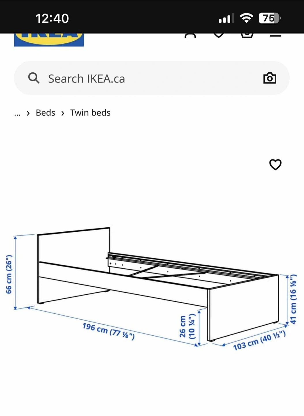 Selling a white IKEA Hemnes twin bed frame. It's in good condition and ready for a new home. Dimensions are 196 cm (77 1/8") long and 103 cm (40 1/2") wide. Perfect for a kid's room or a guest room or single person.