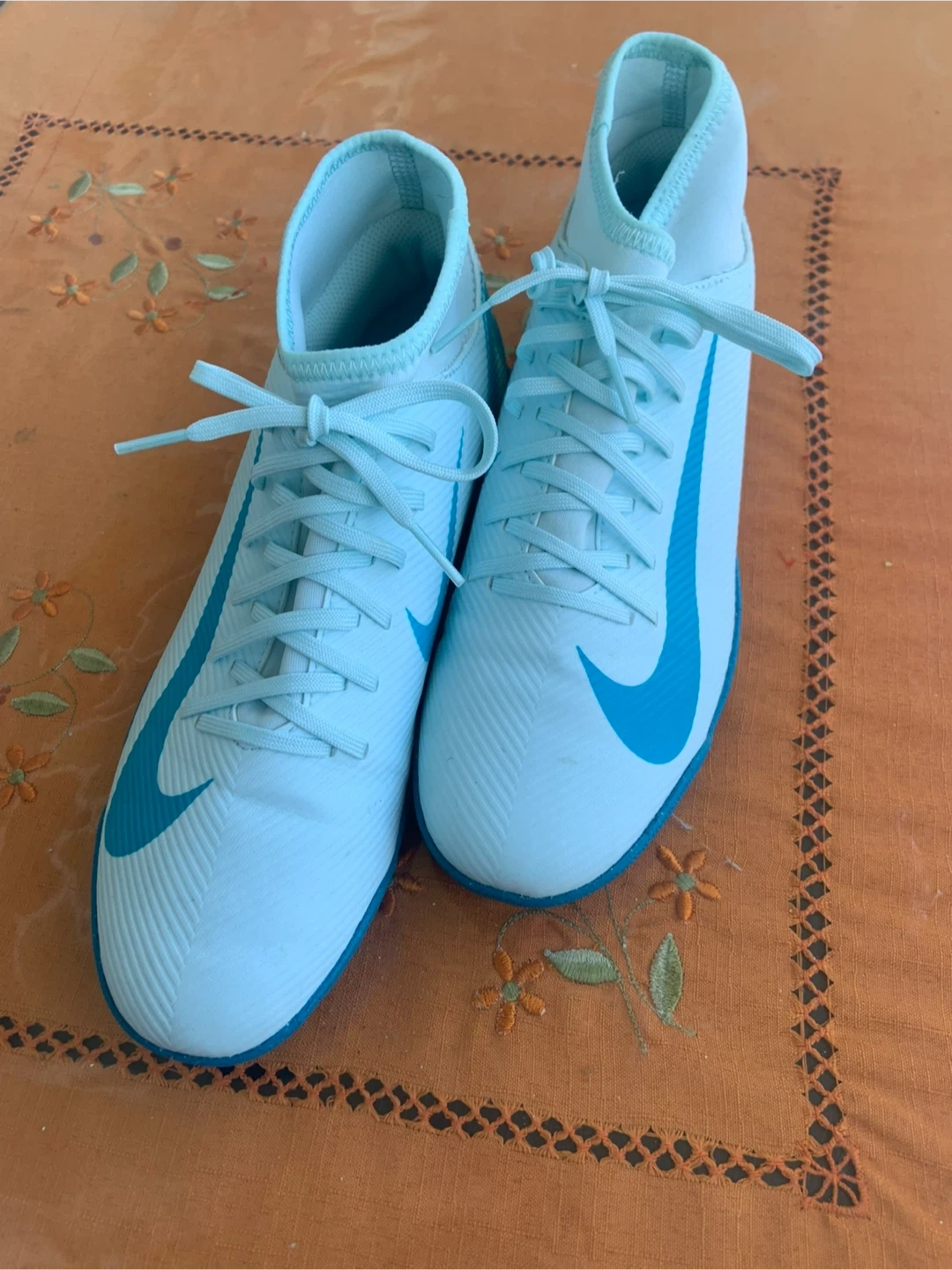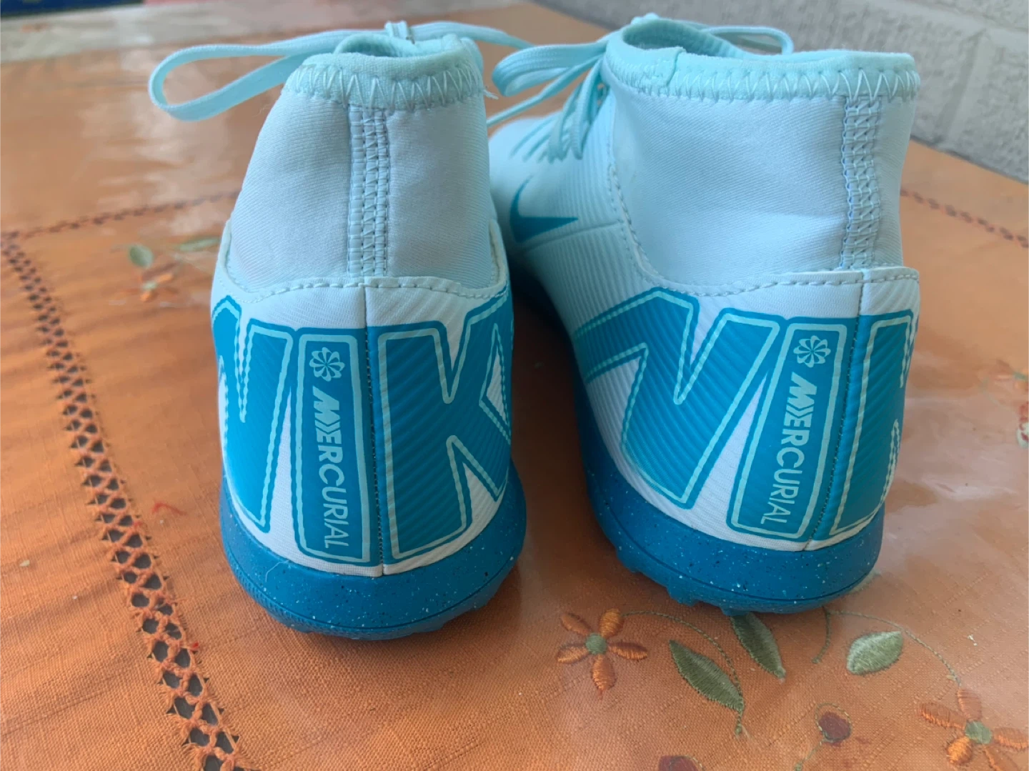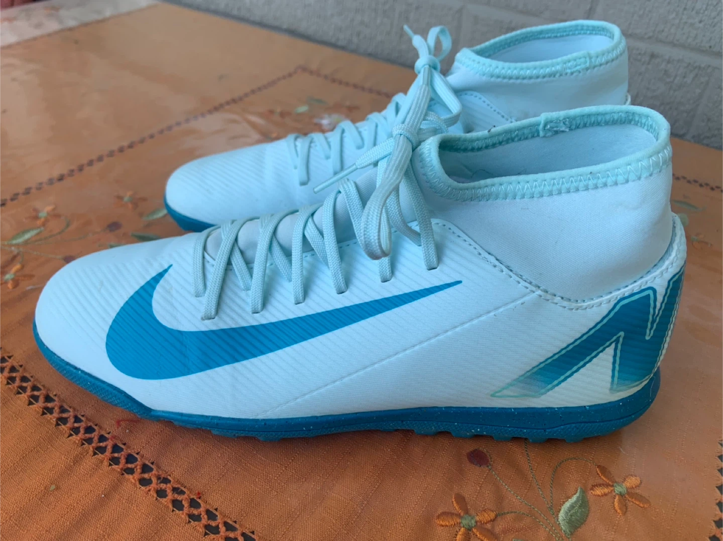 Selling a pair of Nike Mercurial soccer shoes in US size 7. They are in great shape and ready for the field! The shoes feature a stylish light blue and teal colour scheme. Perfect for your next game or practice!