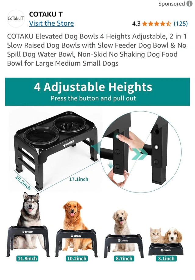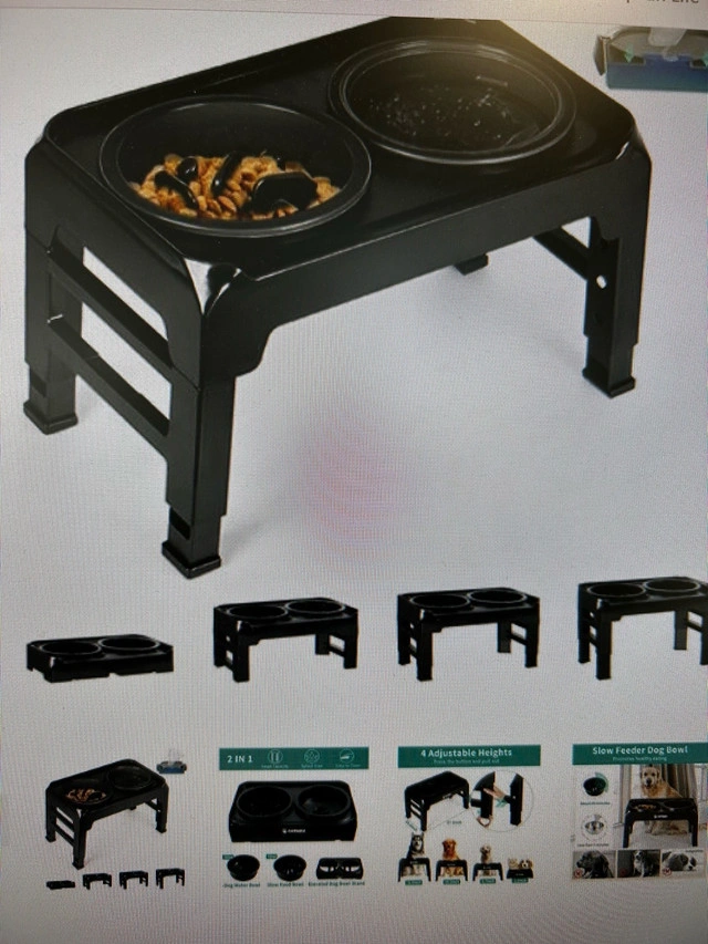 Elevate your furry friend's dining experience with this Cotaku T elevated dog bowl, featuring adjustable heights and a 2-in-1 slow feeder design for medium and small dogs. This bowl is designed to promote better digestion and reduce neck strain for your pet. This item is in used condition.