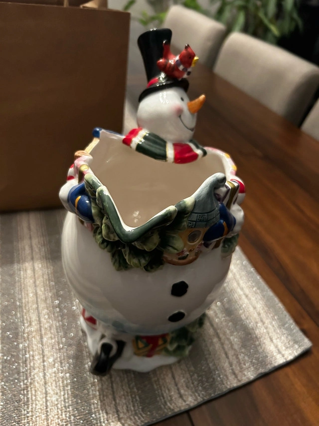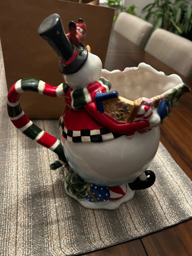 Add a touch of festive charm to your home with this Fitz and Floyd Classics Sullivan the Snowman Pitcher! This delightful, hand-crafted china pitcher features a cheerful snowman design, perfect for serving your favourite beverages during the holiday season or as a whimsical decorative piece. It's in good used condition, ready to bring joy to your kitchen or collection.