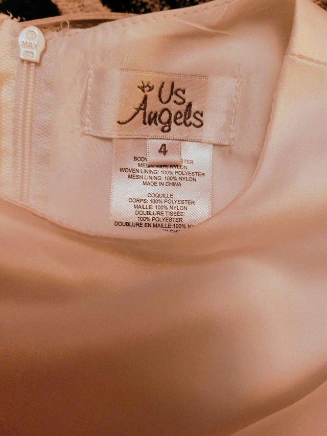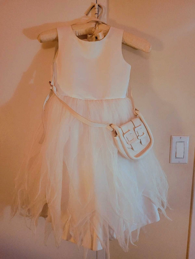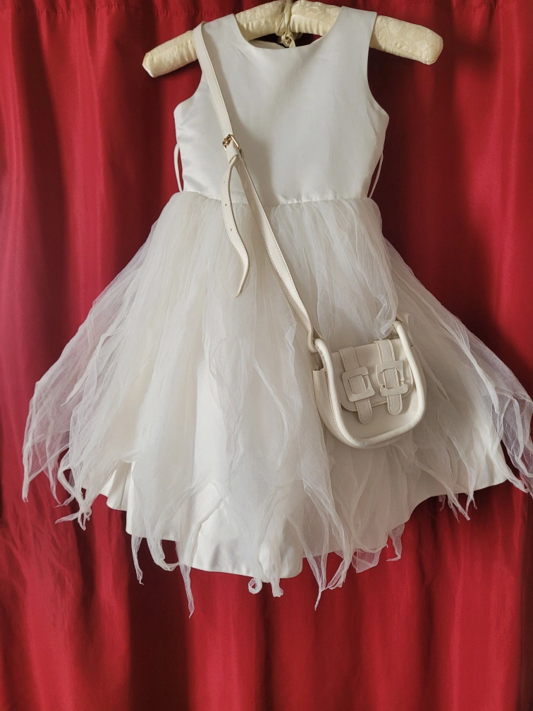 This is a beautiful, gently worn Us Angels dress, perfect for a special occasion. Featuring a sleeveless design and delicate detailing, this dress is in excellent condition. It also comes with a matching purse. * Brand: Us Angels * Size: 4 * Colour: Off-White * Material: Polyester, Nylon This dress is so adorable. Don't miss out on this charming addition to your child's wardrobe!