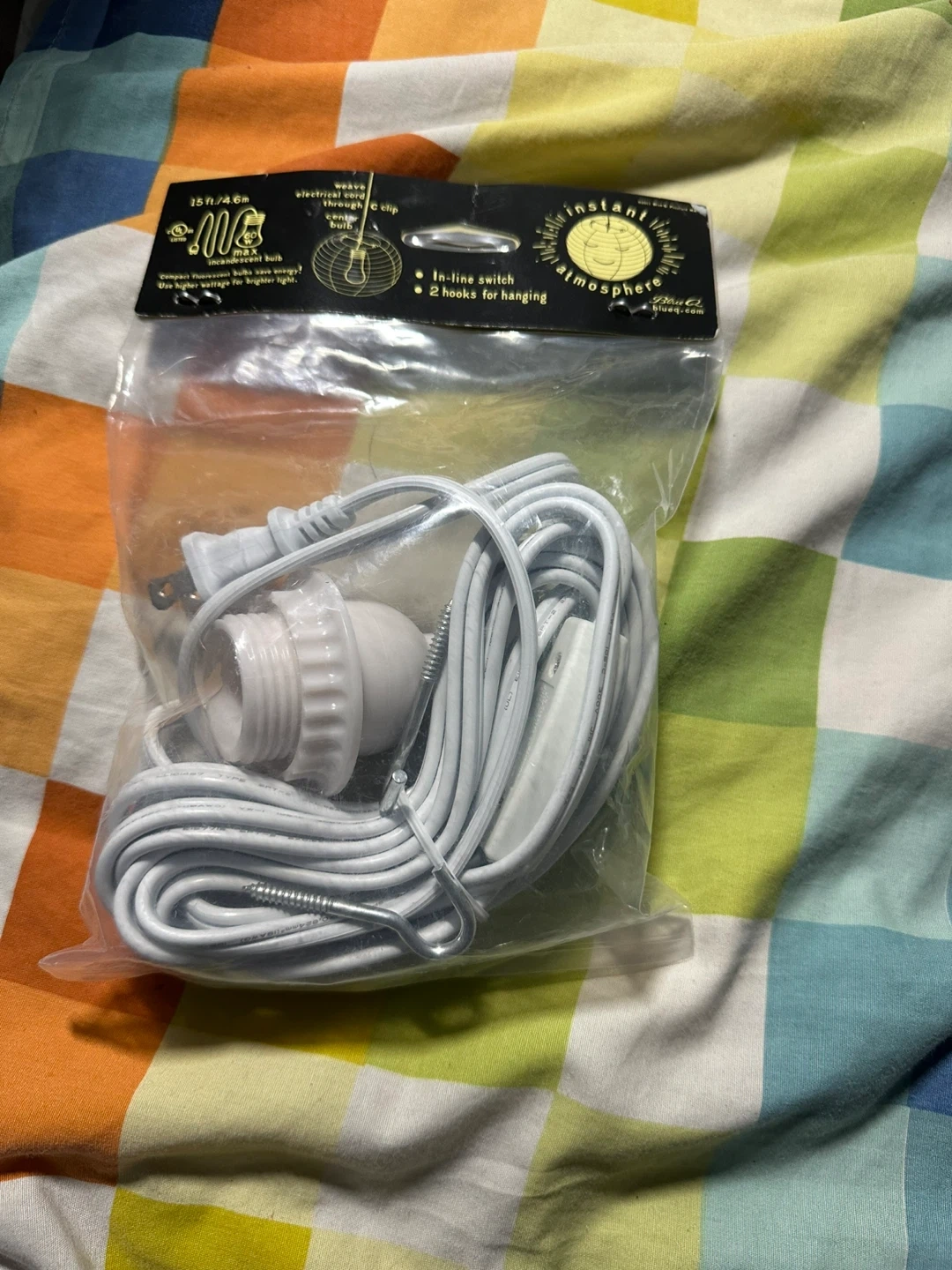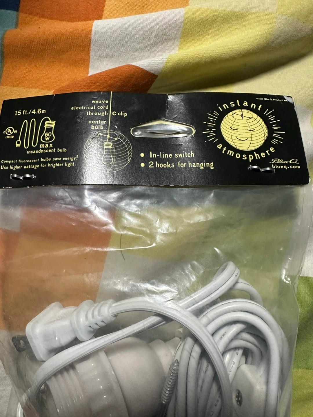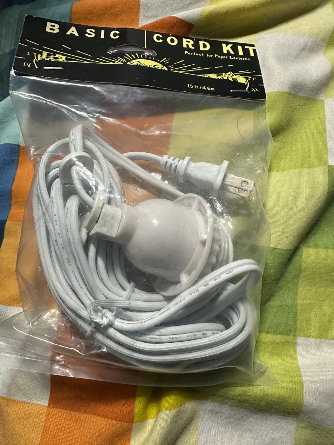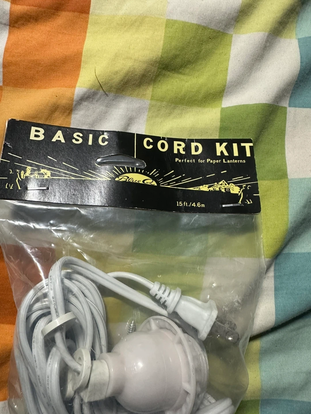 248Selling a new BlueQ Basic Cord Kit, perfect for paper lanterns! It's 15 ft/4.6m long and includes an in-line switch and 2 hooks for hanging. It’s designed for a max 60W incandescent bulb, but compact fluorescent bulbs save energy!