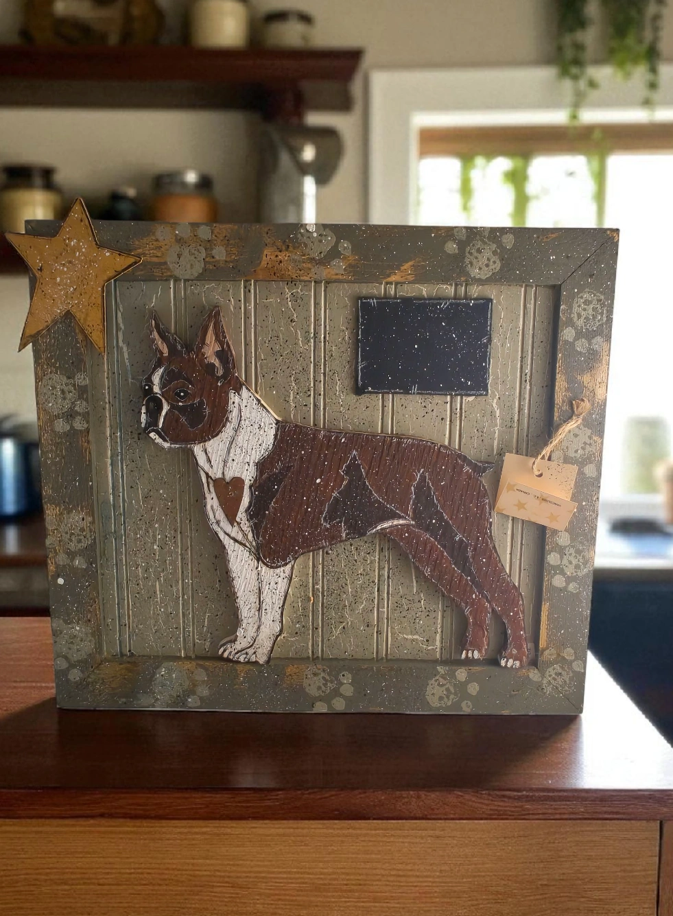 Cute wooden dog wall art with room for a name or quote! It's in great condition and ready to find a new home Approximately 17" x 15"