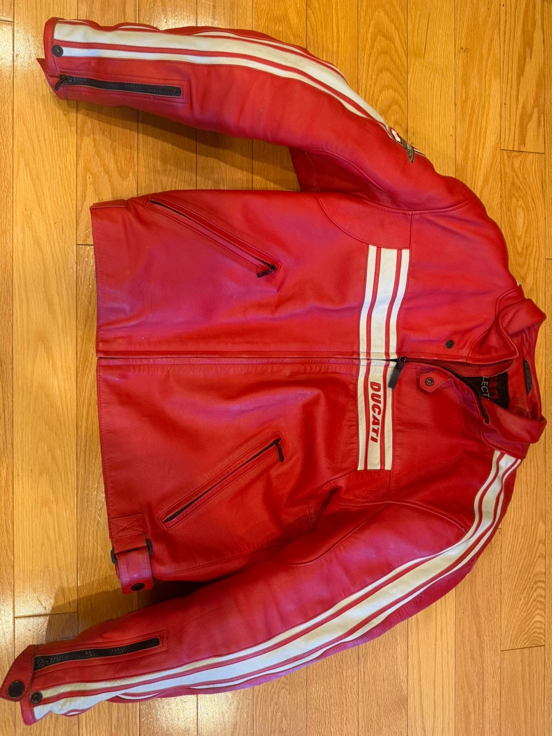 27Here's a sharp-looking Ducati Meccanica Bologna leather jacket in a vibrant red! It features white stripes and the classic Ducati logo. A stylish piece for any motorcycle enthusiast or anyone who appreciates a cool leather jacket with shoulder and elbow pads.